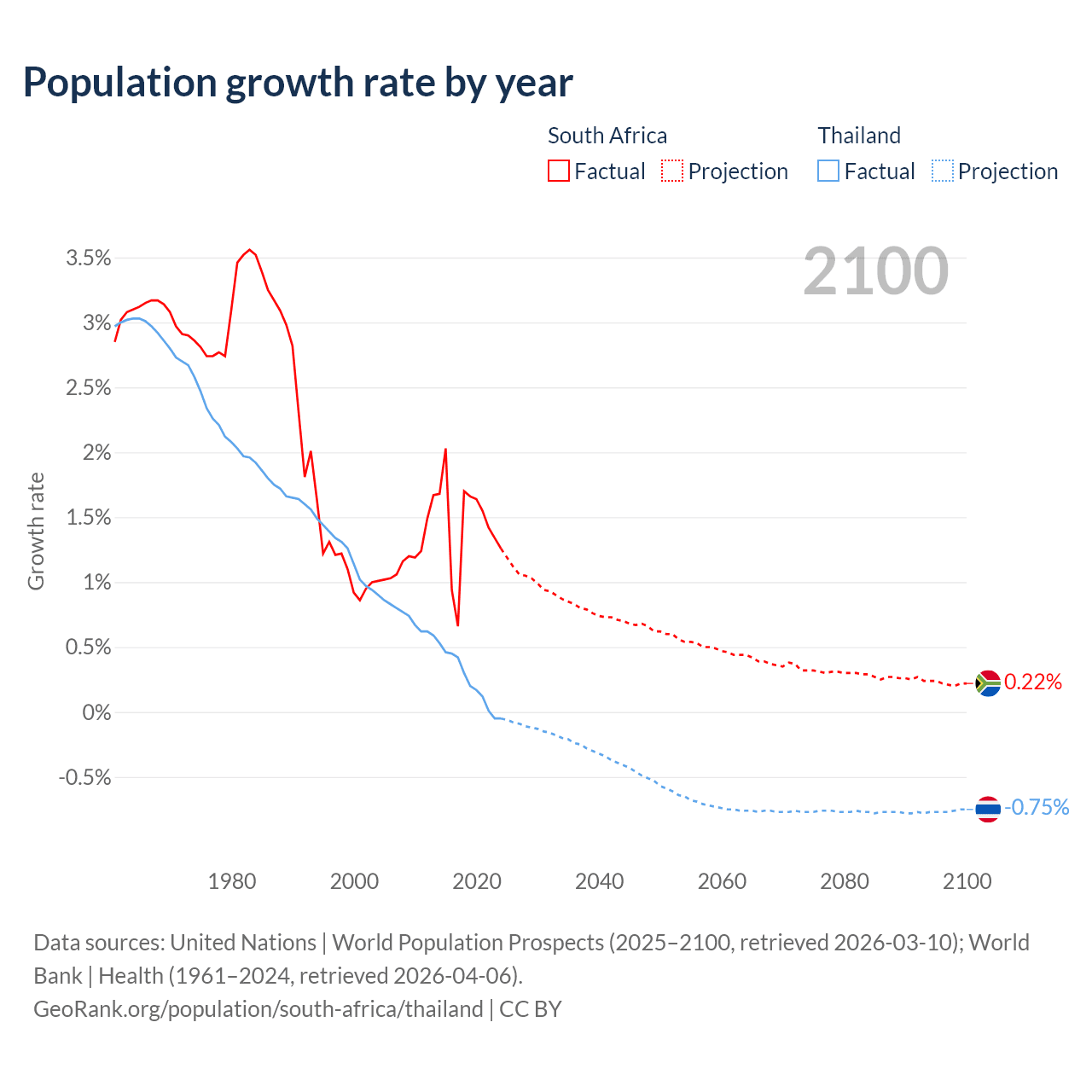 - For the last 10 years, South Africa has had an average growth rate of +1.44% per year vs +0.23% in Thailand.