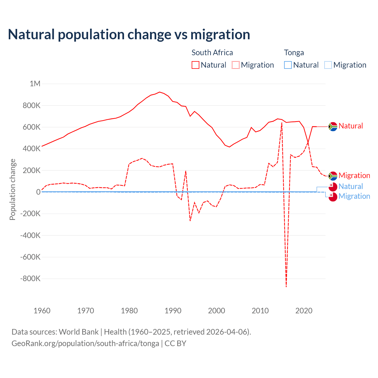 Over the last 10 years, 72.8% of the population change in South Africa is from natural causes (a gain of 6,190,027 people) and 27.2% is from migration (a gain of 2,316,795 people). In Tonga 46.9% is from natural causes (a gain of 18,919 people) and 53.1% is from migration (a loss of 21,384 people).