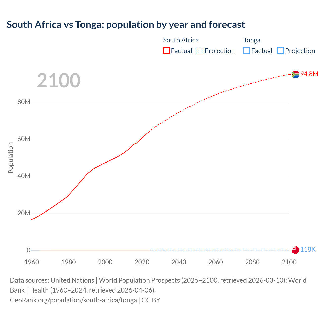 The latest officially reported population of South Africa was 64,007,187 in 2024 vs 104,175 people in Tonga in 2024. In 2026, based on the adjusted UN estimation, the current South Africa's population is 65,683,993 people compared to 103,309 in Tonga.