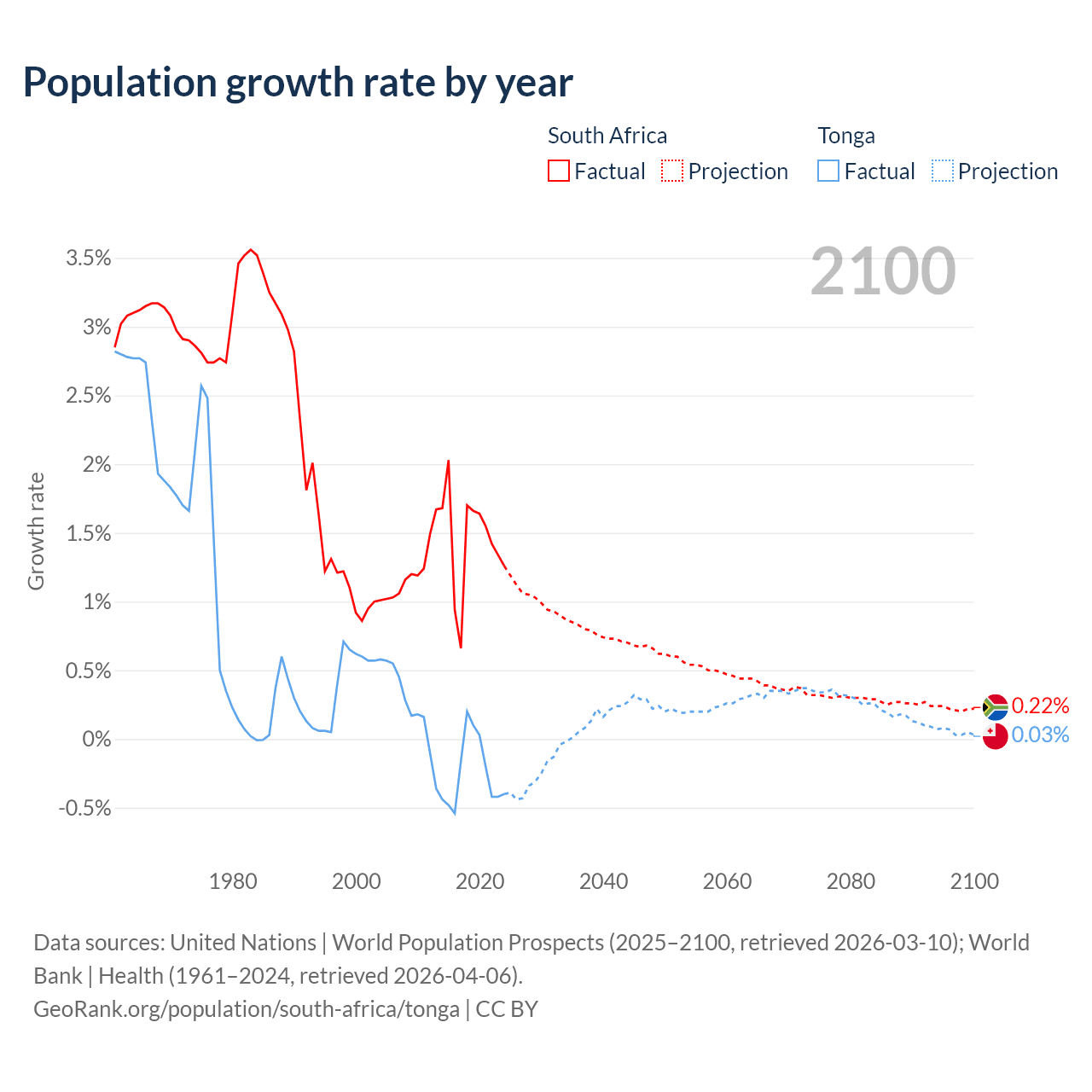 - For the last 10 years, South Africa has had an average growth rate of +1.44% per year vs -0.25% in Tonga.