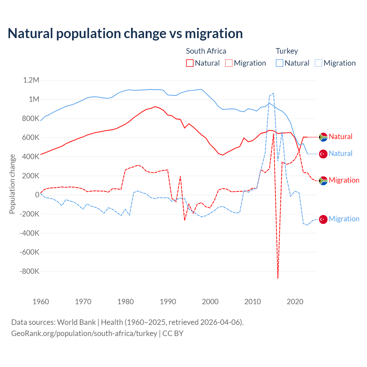 Over the last 10 years, 72.8% of the population change in South Africa is from natural causes (a gain of 6,190,027 people) and 27.2% is from migration (a gain of 2,316,795 people). In Turkey 73% is from natural causes (a gain of 7,333,352 people) and 27% is from migration (a gain of 2,718,916 people).