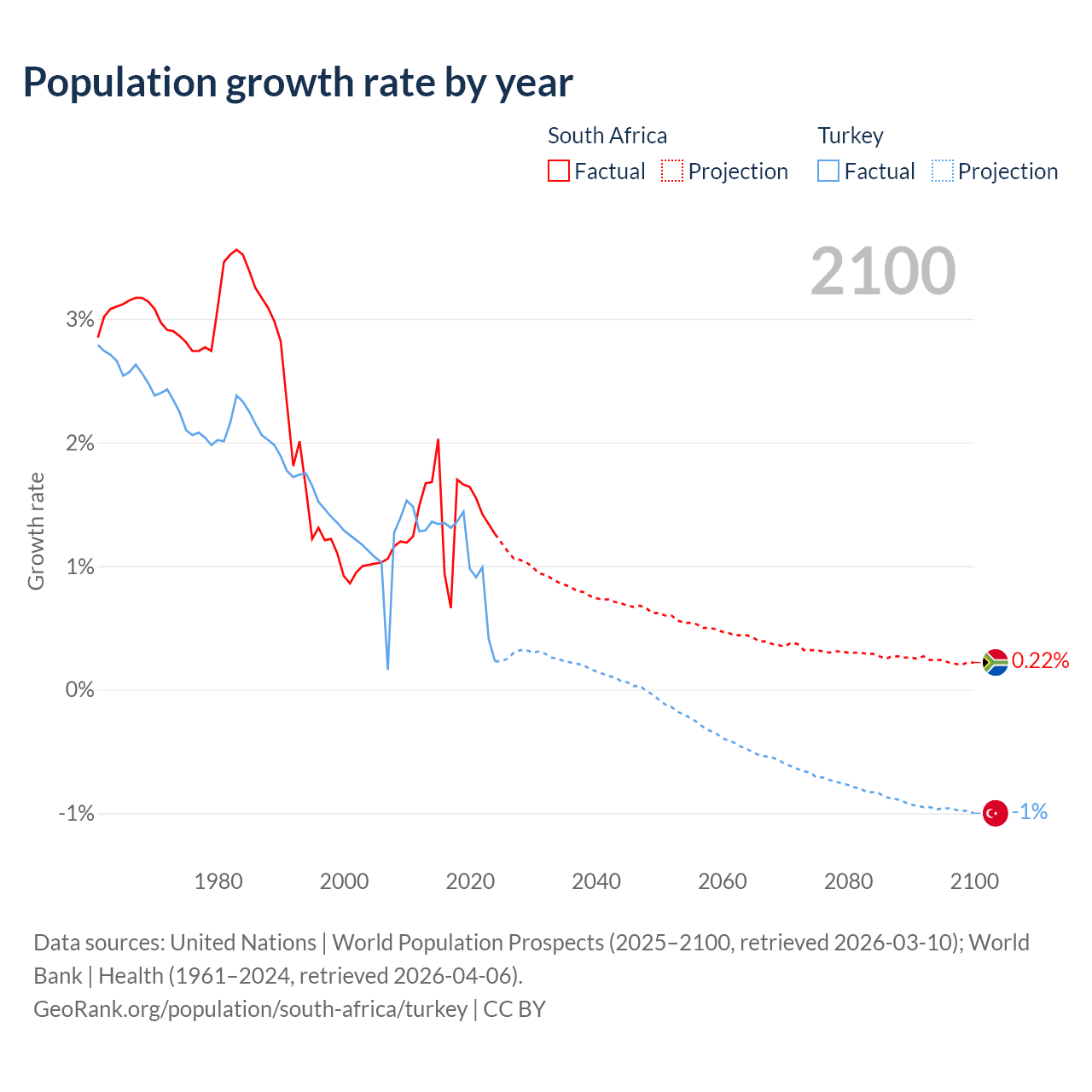 - For the last 10 years, South Africa has had an average growth rate of +1.44% per year vs +1.06% in Turkey.