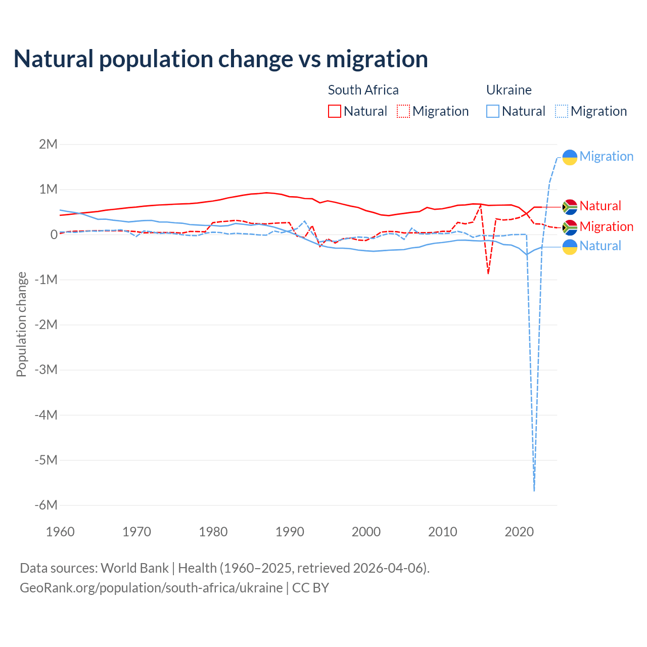 Over the last 10 years, 72.8% of the population change in South Africa is from natural causes (a gain of 6,190,027 people) and 27.2% is from migration (a gain of 2,316,795 people). In Ukraine 28.2% is from natural causes (a loss of 2,435,153 people) and 71.8% is from migration (a loss of 6,198,995 people).