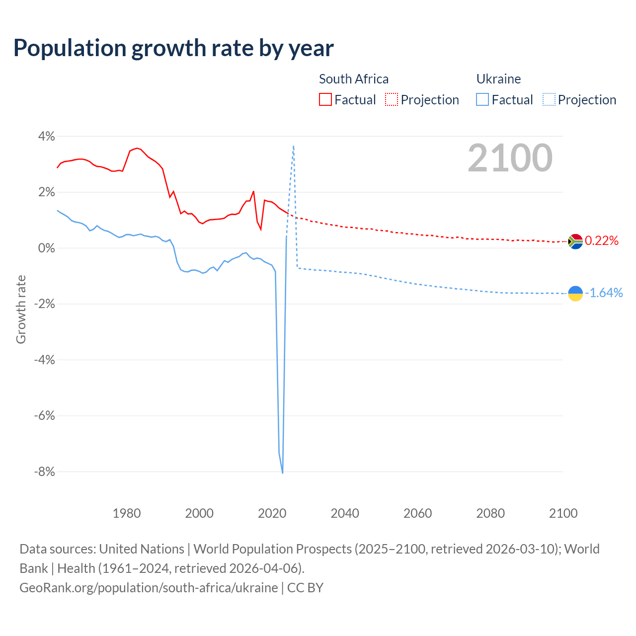 - For the last 10 years, South Africa has had an average growth rate of +1.44% per year vs -1.74% in Ukraine.