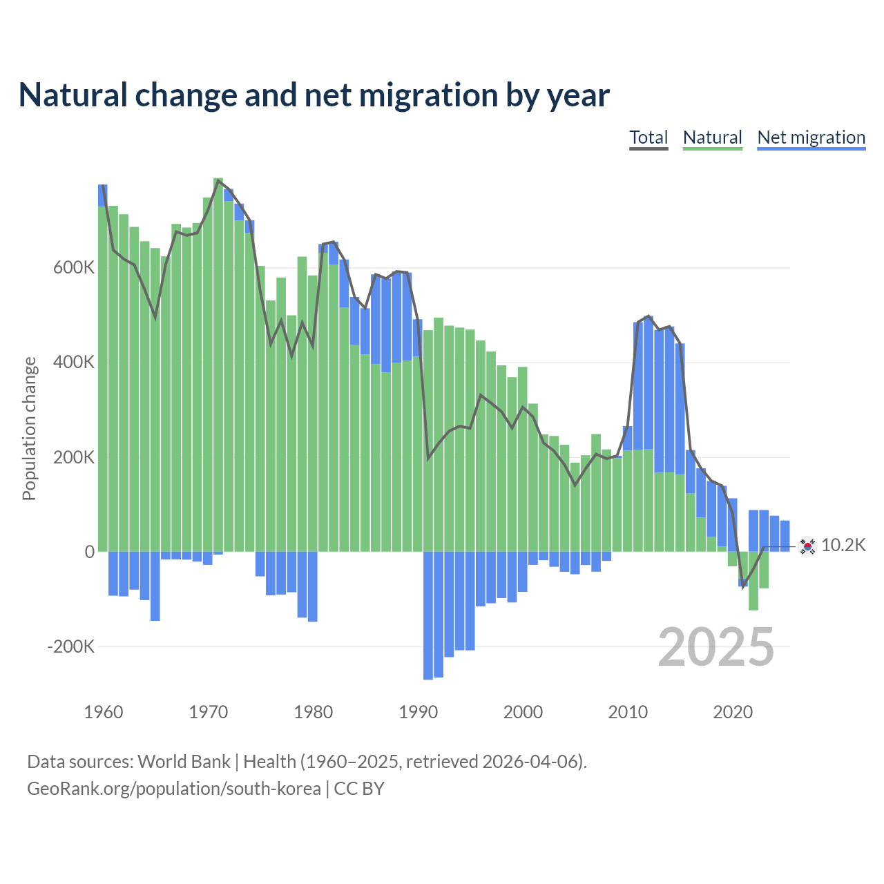 Over the last 10 years, 17.6% of the population change in South Korea is from natural causes (a gain of 277,215 people) and 82.4% is from migration (a gain of 1,298,356 people).