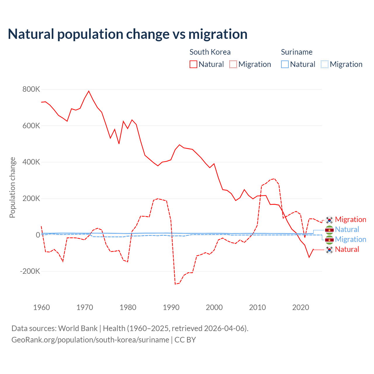 Over the last 10 years, 17.6% of the population change in South Korea is from natural causes (a gain of 277,215 people) and 82.4% is from migration (a gain of 1,298,356 people). In Suriname 90.3% is from natural causes (a gain of 66,709 people) and 9.72% is from migration (a loss of 7,185 people).