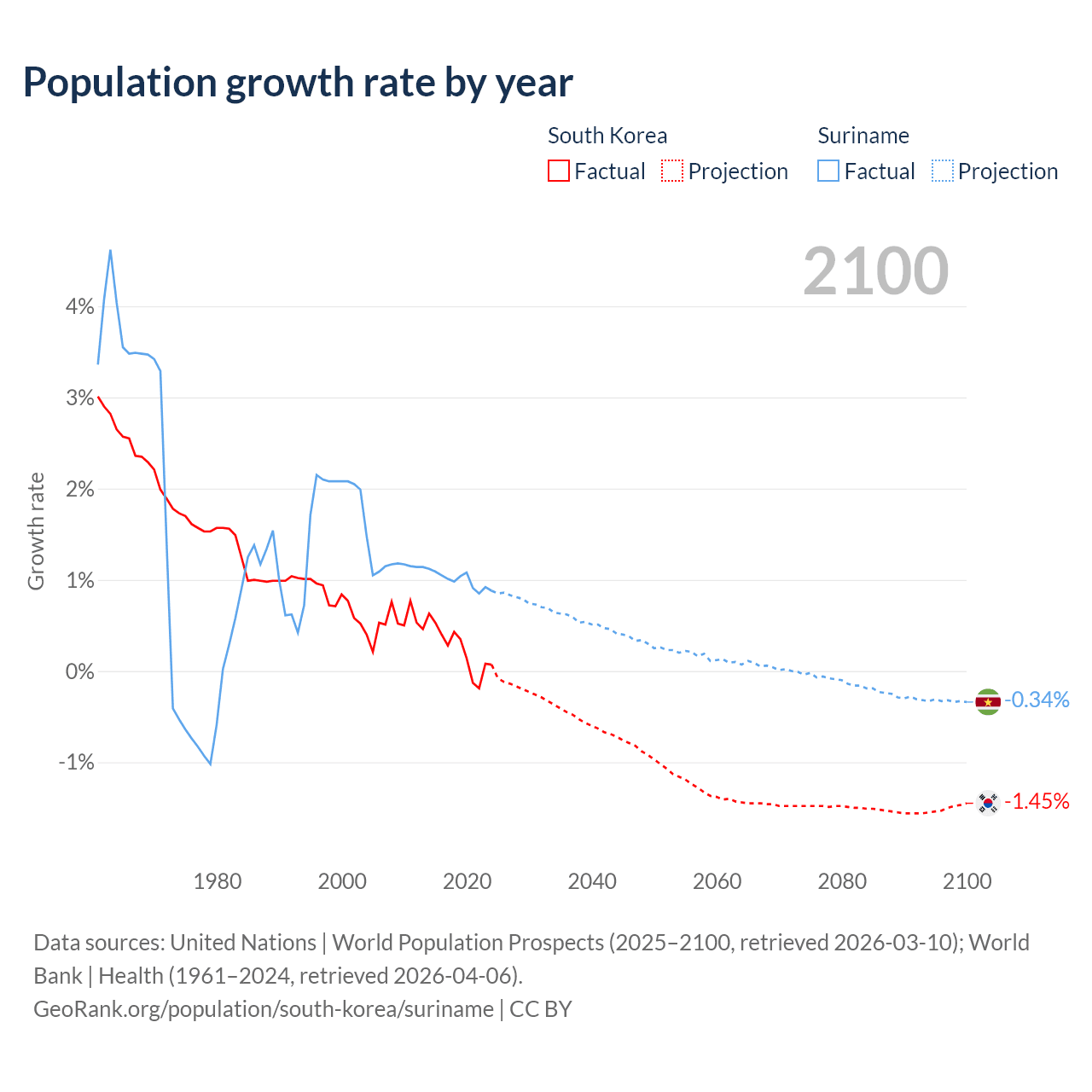 - For the last 10 years, South Korea has had an average growth rate of +0.24% per year vs +0.99% in Suriname.