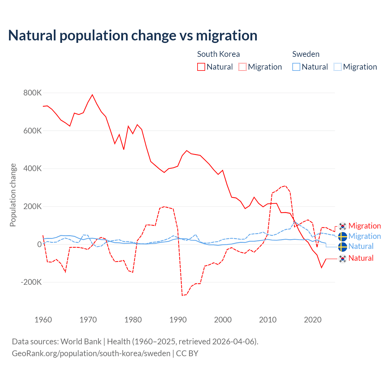 Over the last 10 years, 17.6% of the population change in South Korea is from natural causes (a gain of 277,215 people) and 82.4% is from migration (a gain of 1,298,356 people). In Sweden 21.4% is from natural causes (a gain of 201,900 people) and 78.6% is from migration (a gain of 743,642 people).