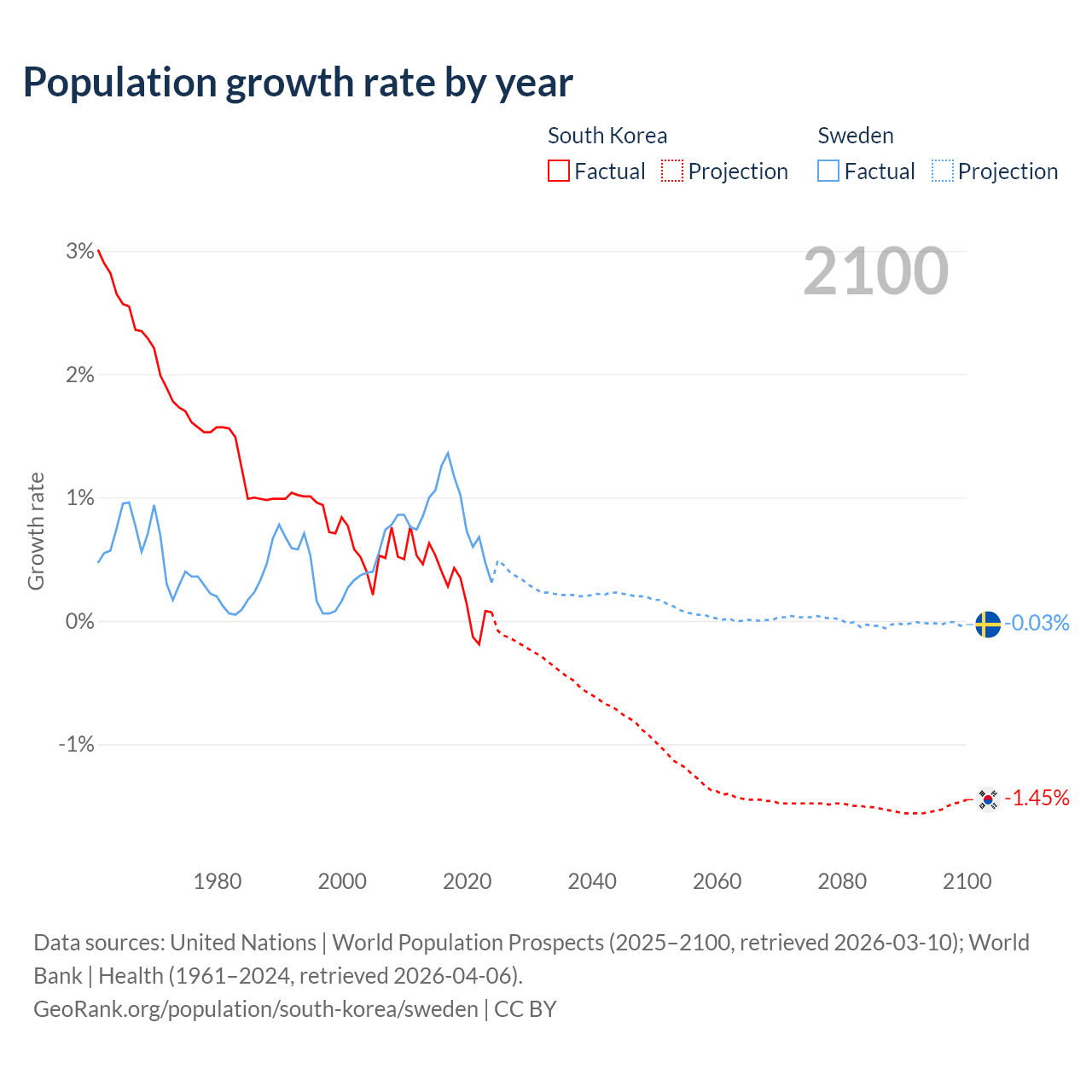 - For the last 10 years, South Korea has had an average growth rate of +0.24% per year vs +0.88% in Sweden.