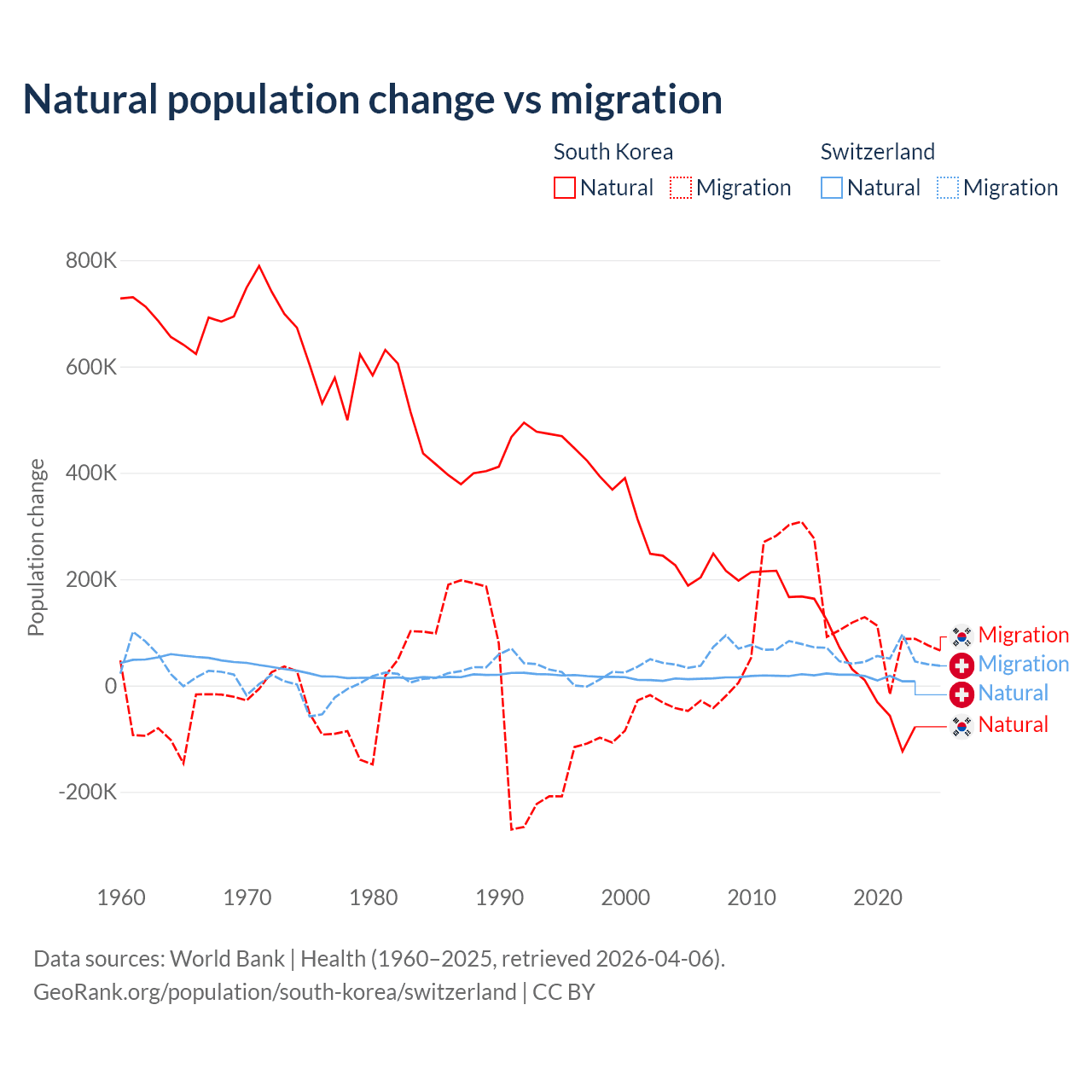 Over the last 10 years, 17.6% of the population change in South Korea is from natural causes (a gain of 277,215 people) and 82.4% is from migration (a gain of 1,298,356 people). In Switzerland 21.6% is from natural causes (a gain of 165,354 people) and 78.4% is from migration (a gain of 600,145 people).