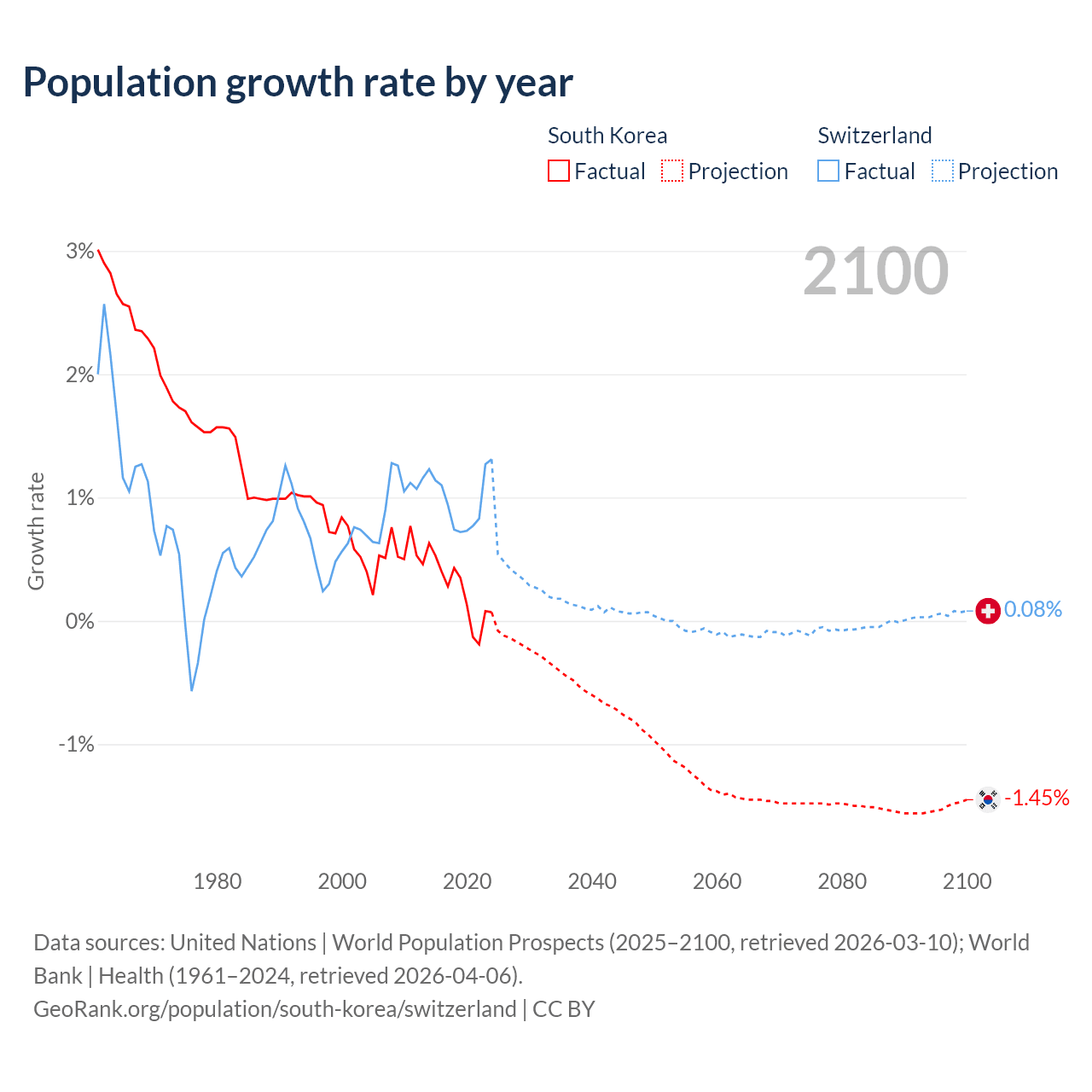 - For the last 10 years, South Korea has had an average growth rate of +0.24% per year vs +0.98% in Switzerland.
