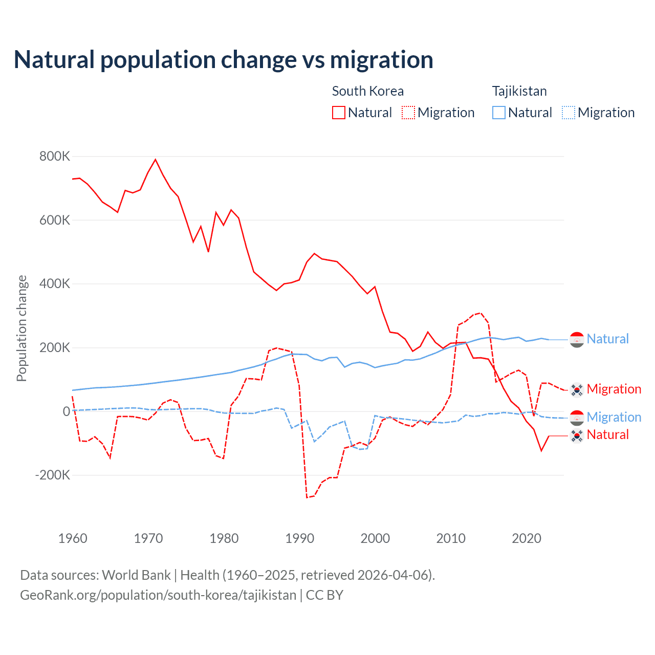Over the last 10 years, 17.6% of the population change in South Korea is from natural causes (a gain of 277,215 people) and 82.4% is from migration (a gain of 1,298,356 people). In Tajikistan 96% is from natural causes (a gain of 2,266,045 people) and 3.95% is from migration (a loss of 93,205 people).