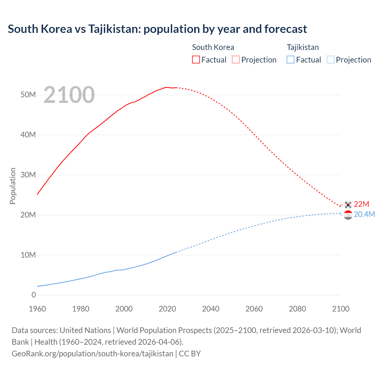 South Korea vs Tajikistan: population by year and forecast
