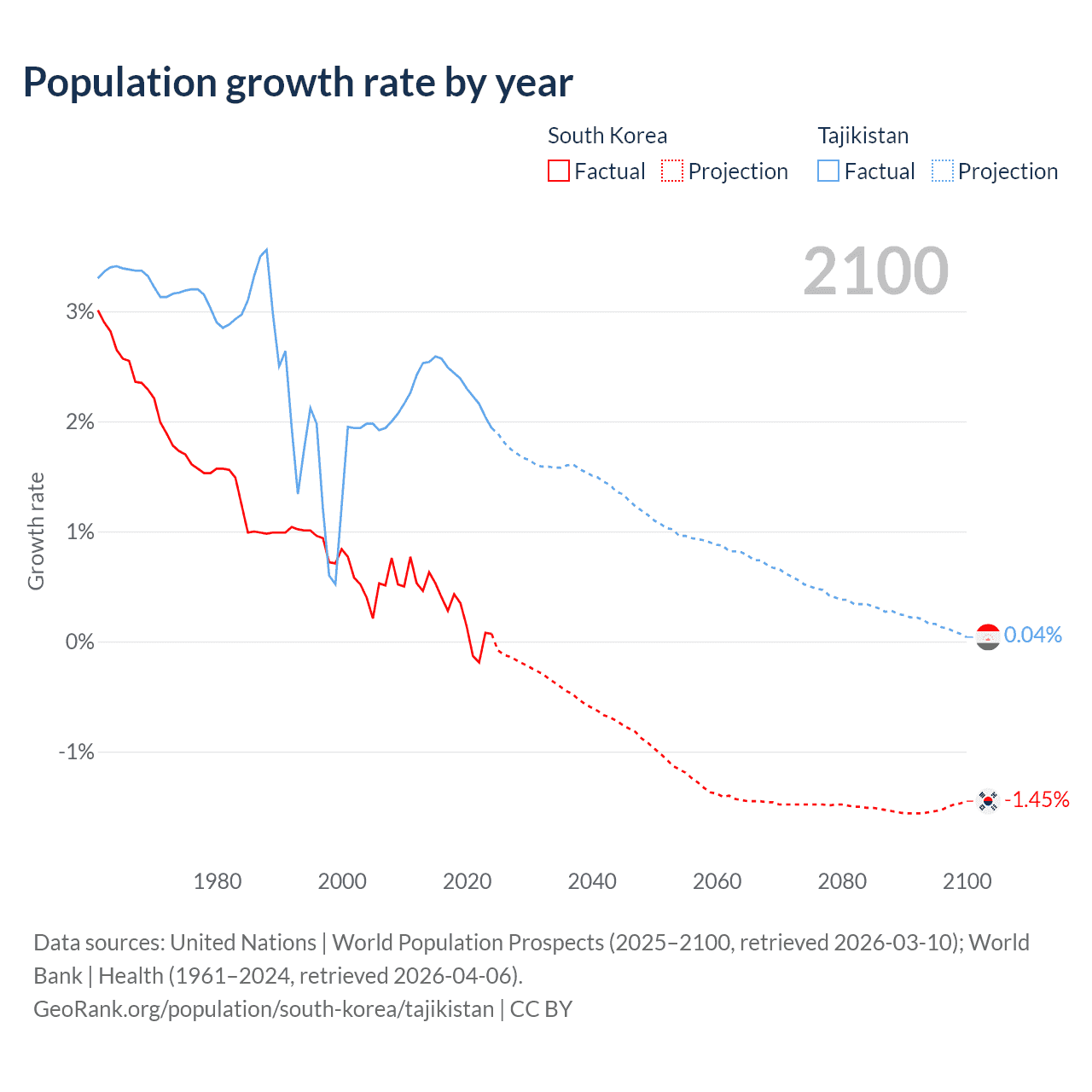 - For the last 10 years, South Korea has had an average growth rate of +0.24% per year vs +2.33% in Tajikistan.