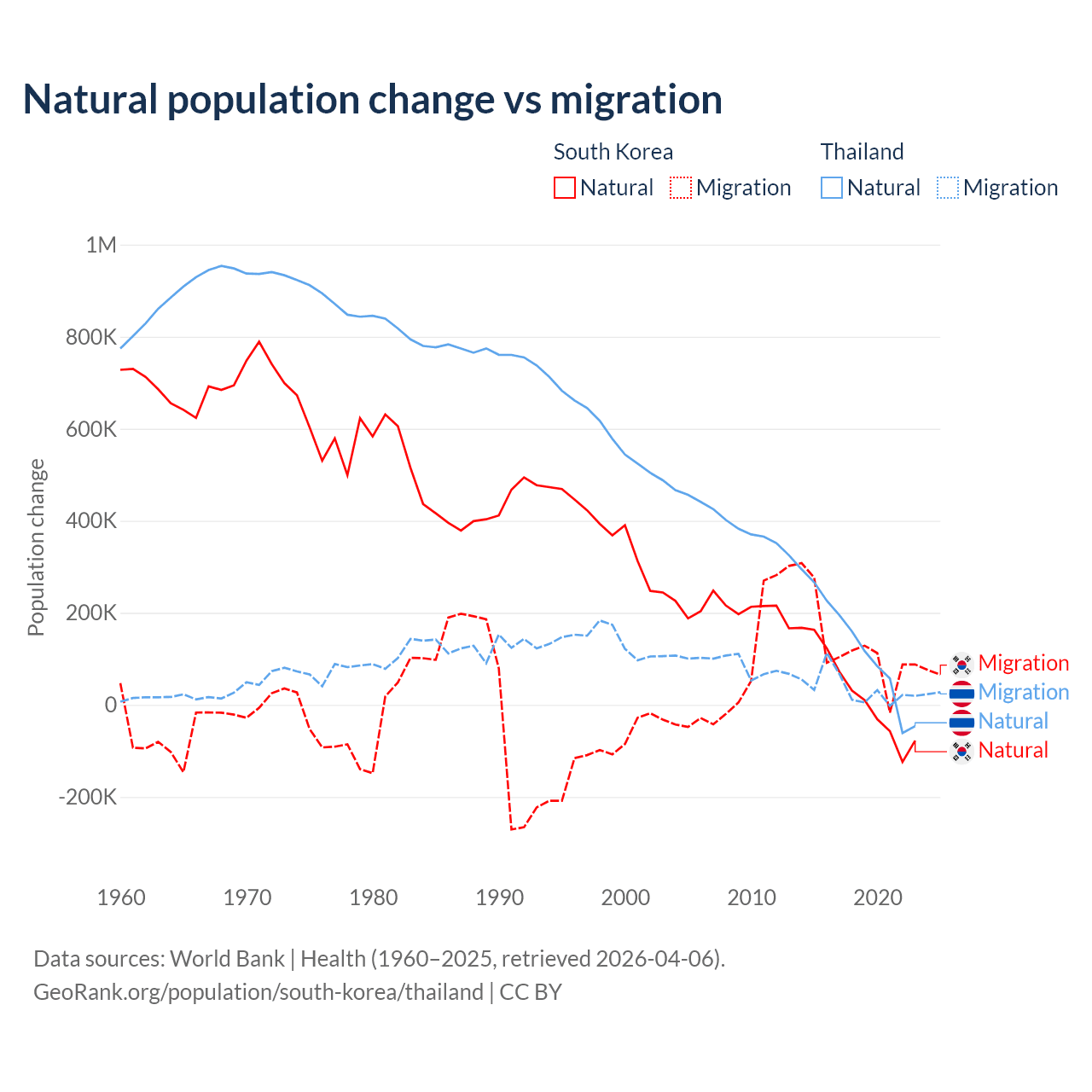 Over the last 10 years, 17.6% of the population change in South Korea is from natural causes (a gain of 277,215 people) and 82.4% is from migration (a gain of 1,298,356 people). In Thailand 78.4% is from natural causes (a gain of 1,292,528 people) and 21.6% is from migration (a gain of 355,361 people).