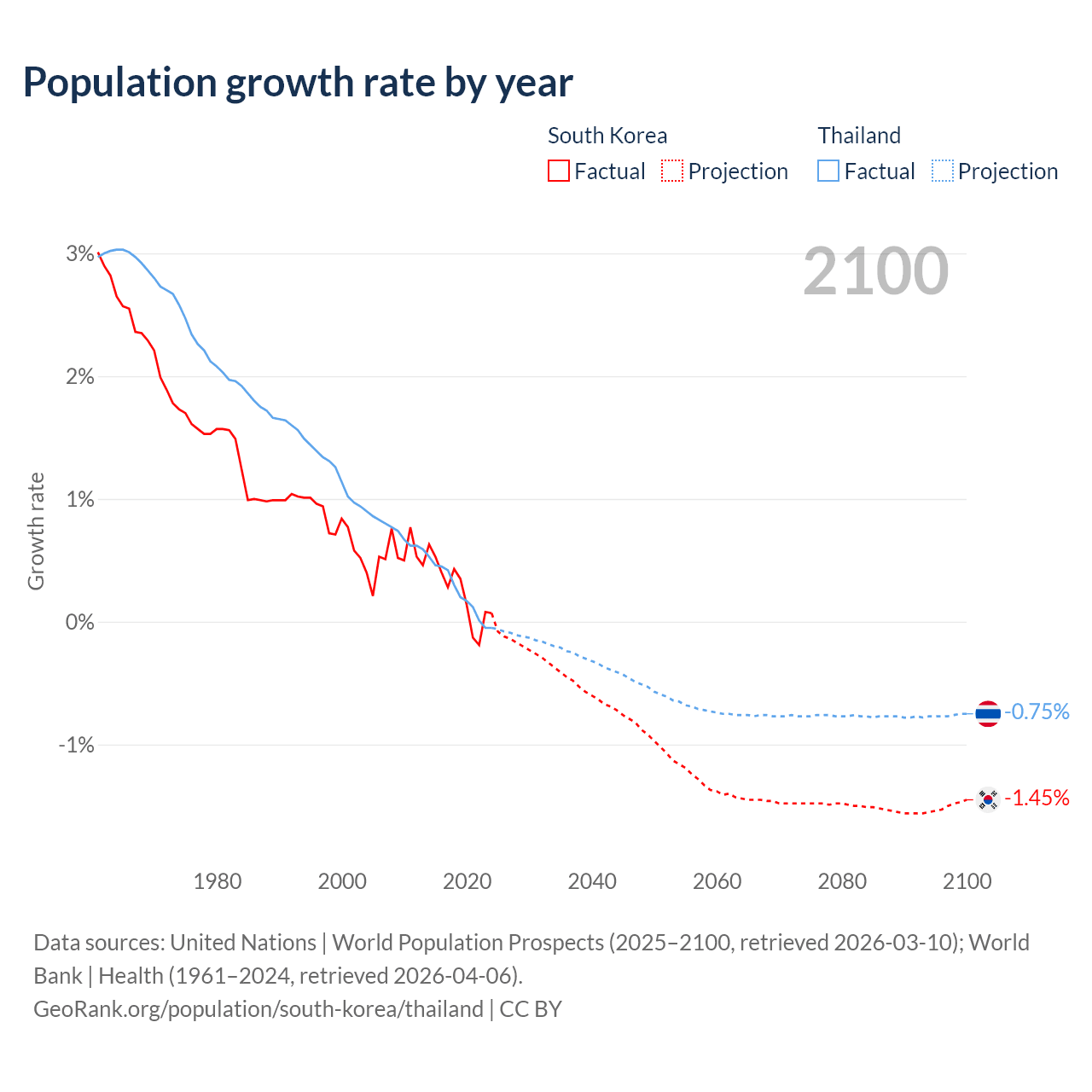 - For the last 10 years, South Korea has had an average growth rate of +0.24% per year vs +0.23% in Thailand.