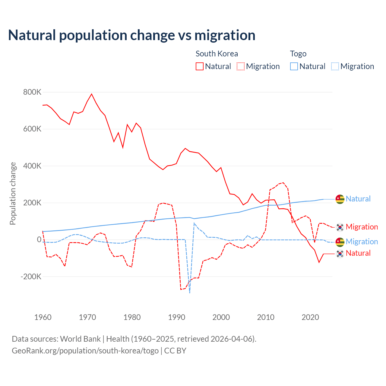 Over the last 10 years, 17.6% of the population change in South Korea is from natural causes (a gain of 277,215 people) and 82.4% is from migration (a gain of 1,298,356 people). In Togo 99.1% is from natural causes (a gain of 2,052,115 people) and 0.86% is from migration (a loss of 17,852 people).