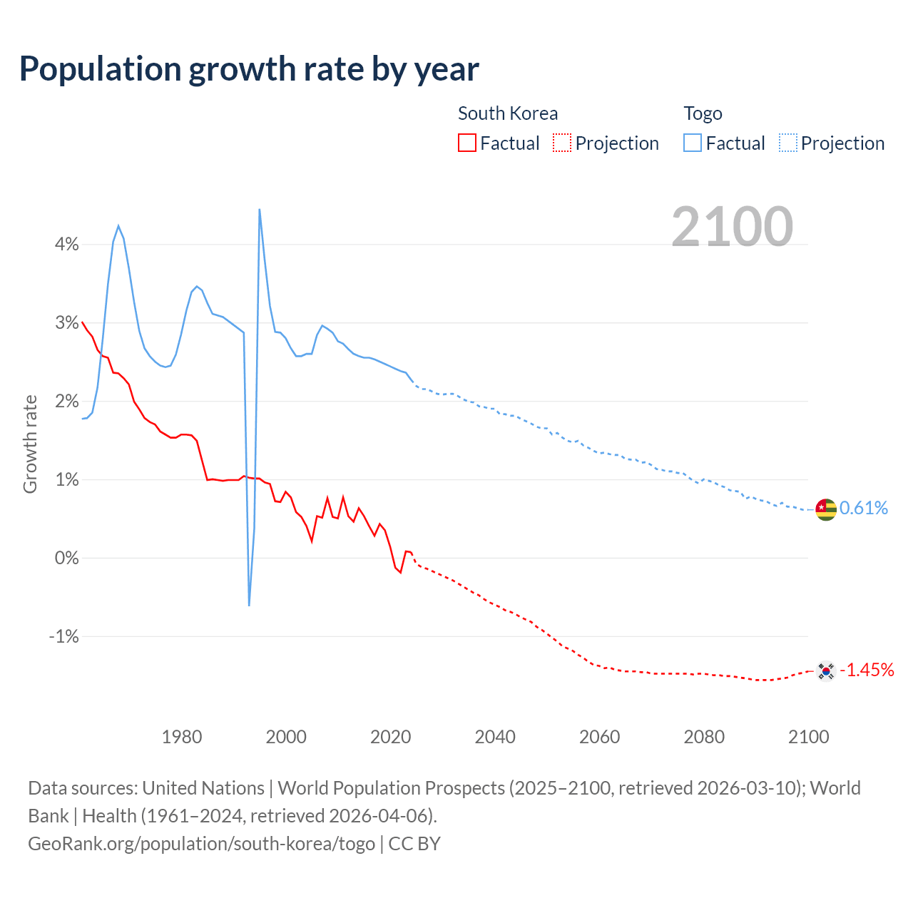 - For the last 10 years, South Korea has had an average growth rate of +0.24% per year vs +2.46% in Togo.