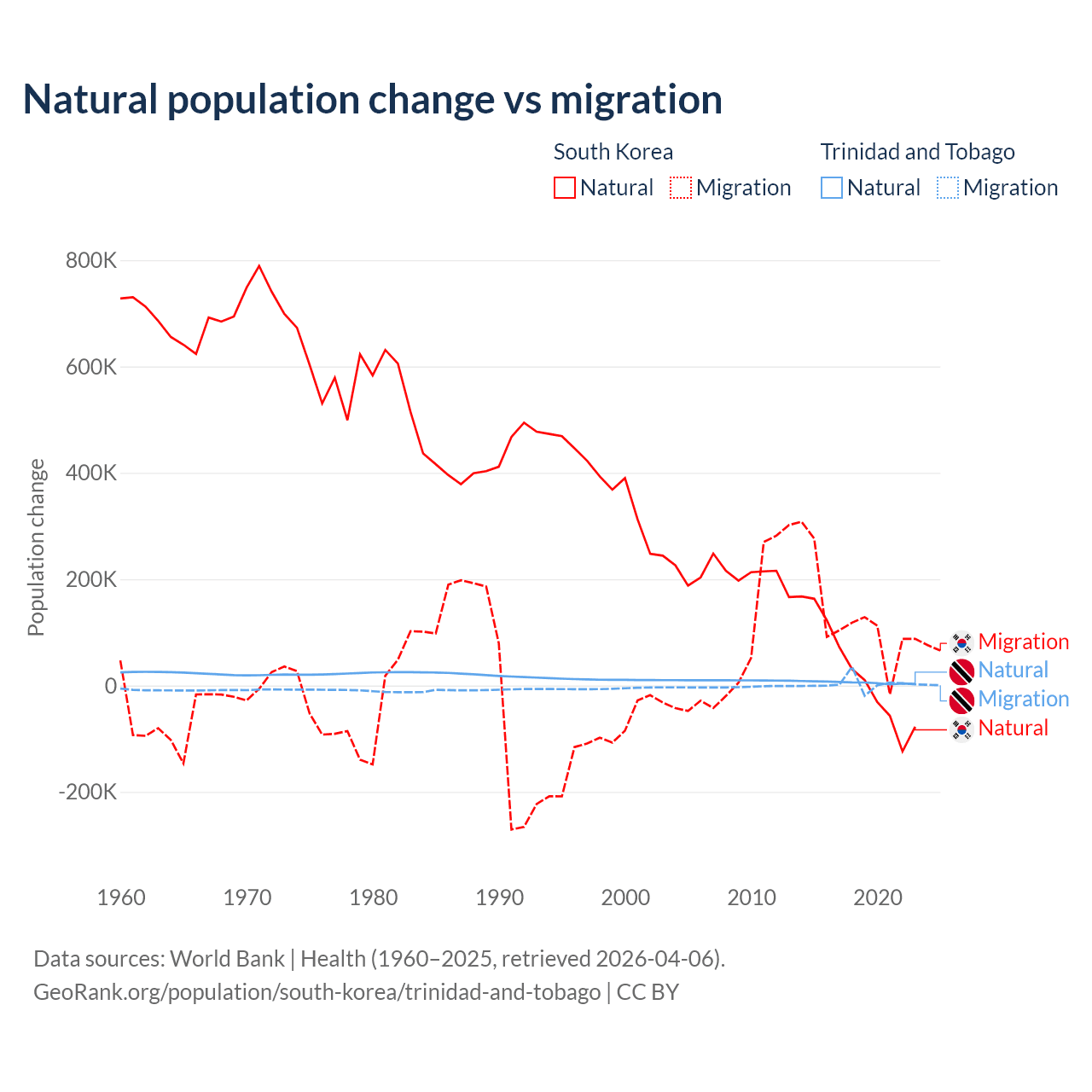 Over the last 10 years, 17.6% of the population change in South Korea is from natural causes (a gain of 277,215 people) and 82.4% is from migration (a gain of 1,298,356 people). In Trinidad and Tobago 66% is from natural causes (a gain of 55,887 people) and 34% is from migration (a gain of 28,785 people).