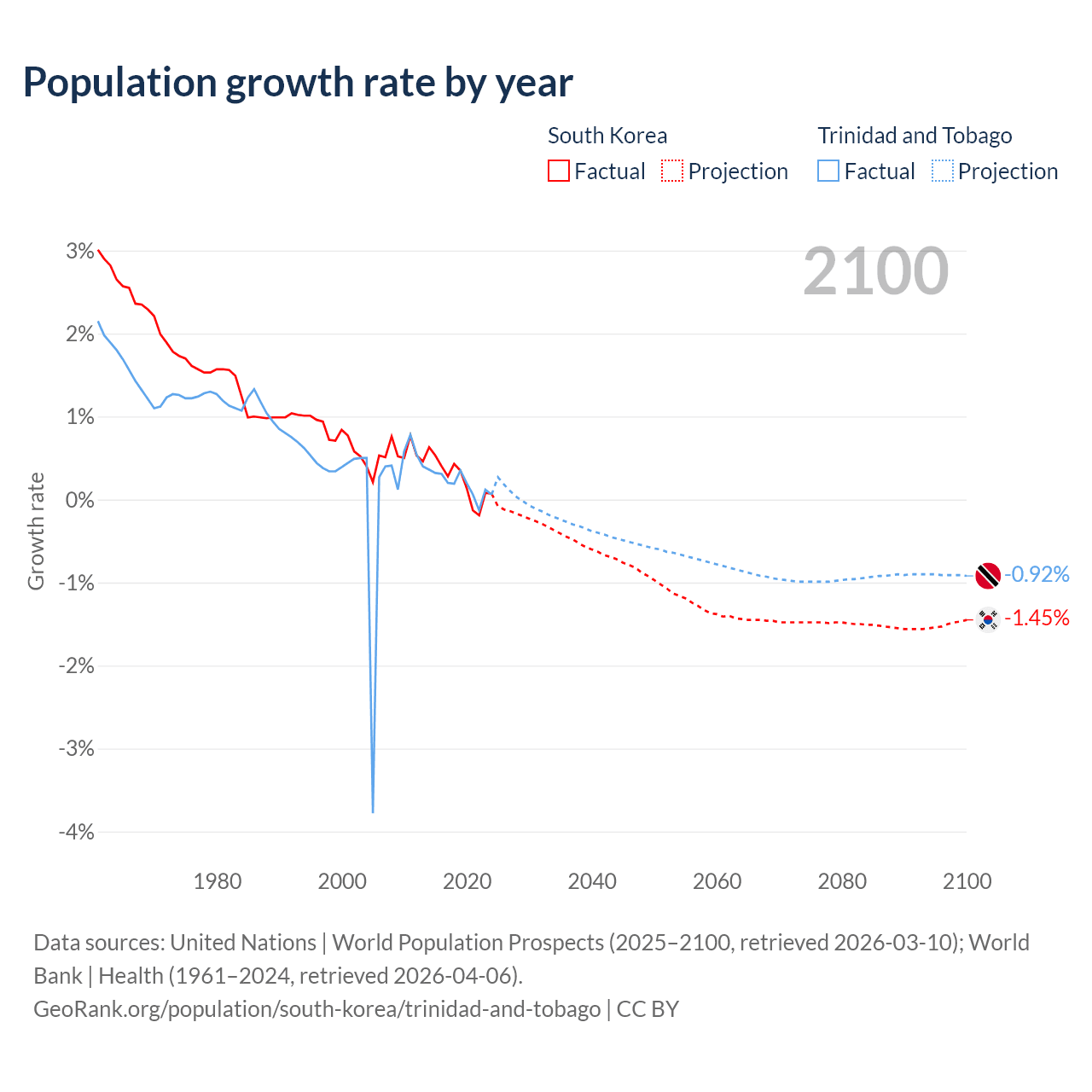 - For the last 10 years, South Korea has had an average growth rate of +0.24% per year vs +0.19% in Trinidad and Tobago.