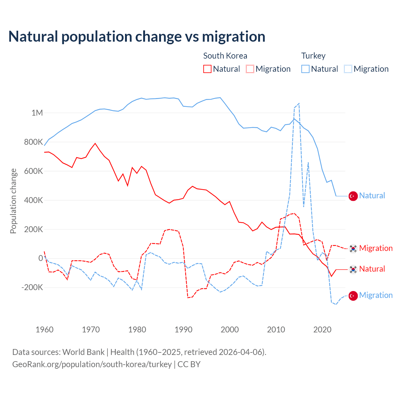 Over the last 10 years, 17.6% of the population change in South Korea is from natural causes (a gain of 277,215 people) and 82.4% is from migration (a gain of 1,298,356 people). In Turkey 73% is from natural causes (a gain of 7,333,352 people) and 27% is from migration (a gain of 2,718,916 people).