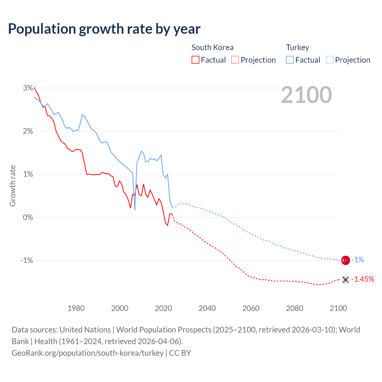 - For the last 10 years, South Korea has had an average growth rate of +0.24% per year vs +1.06% in Turkey.