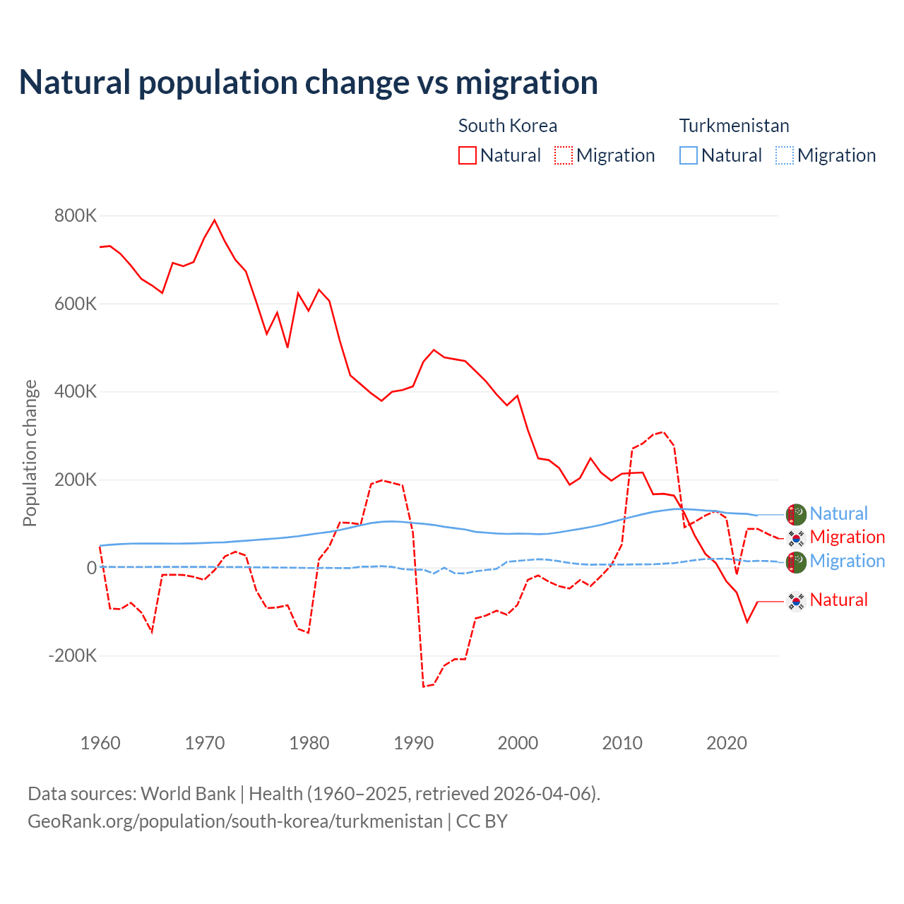 Over the last 10 years, 17.6% of the population change in South Korea is from natural causes (a gain of 277,215 people) and 82.4% is from migration (a gain of 1,298,356 people). In Turkmenistan 89.2% is from natural causes (a gain of 1,270,228 people) and 10.8% is from migration (a gain of 154,379 people).