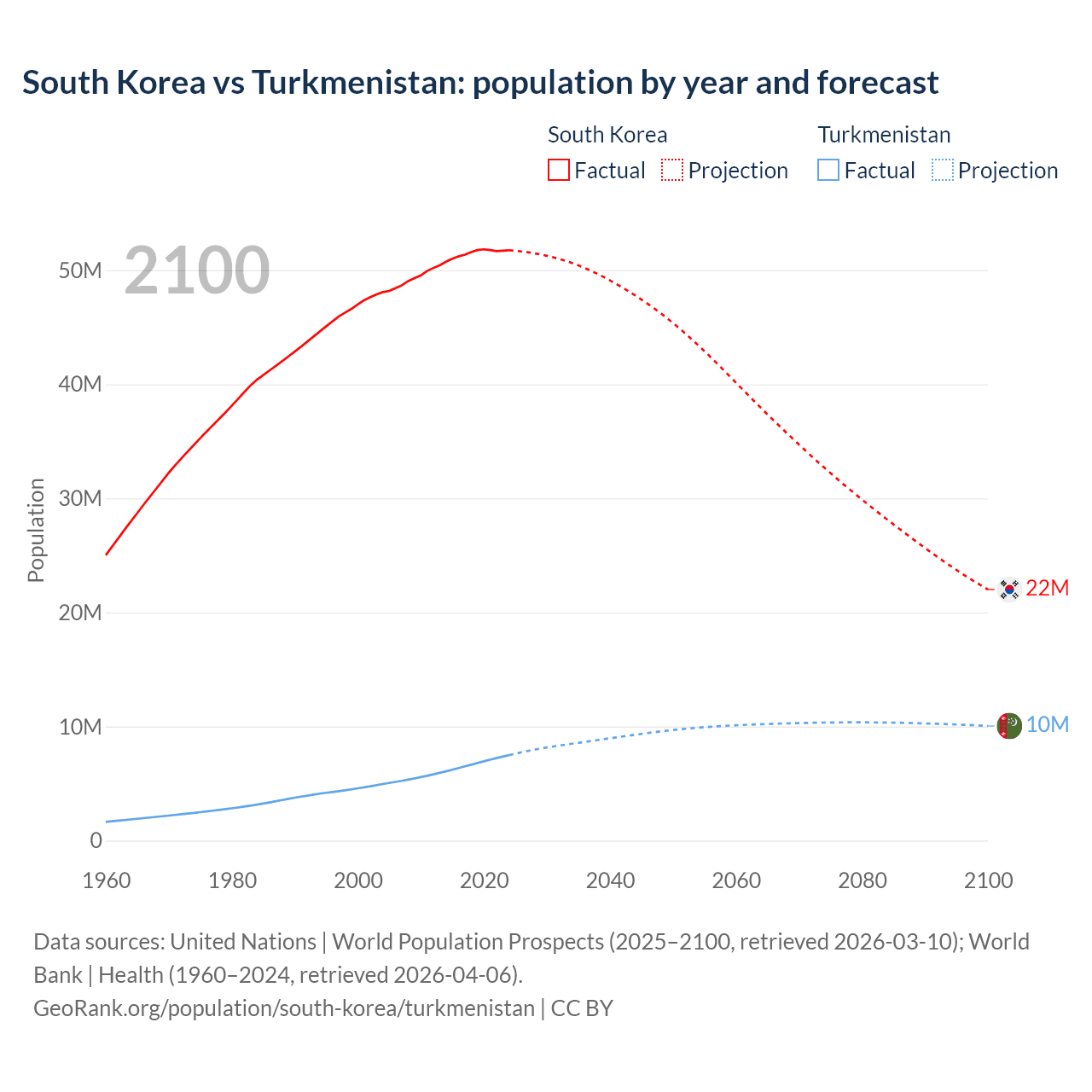 The latest officially reported population of South Korea was 51,751,065 in 2024 vs 7,494,498 people in Turkmenistan in 2024. In 2026, based on the adjusted UN estimation, the current South Korea's population is 51,649,918 people compared to 7,776,557 in Turkmenistan.