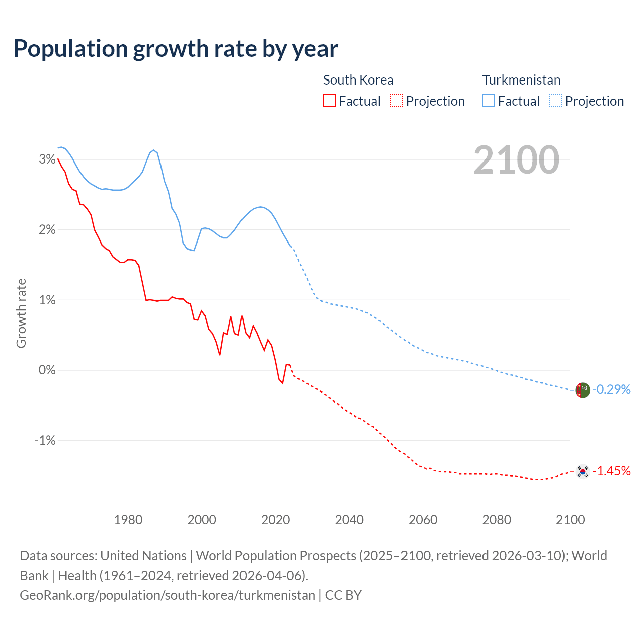 - For the last 10 years, South Korea has had an average growth rate of +0.24% per year vs +2.14% in Turkmenistan.