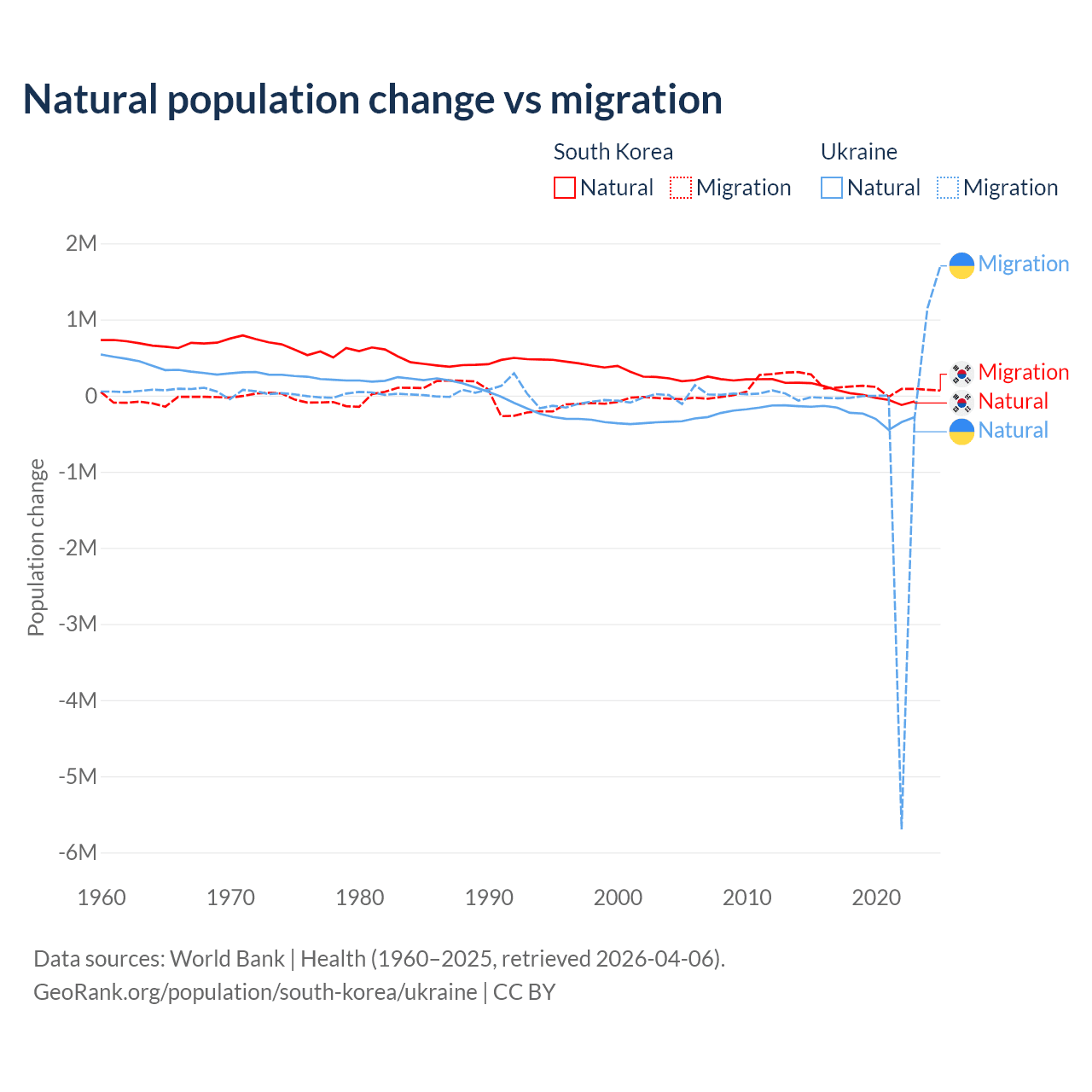 Over the last 10 years, 17.6% of the population change in South Korea is from natural causes (a gain of 277,215 people) and 82.4% is from migration (a gain of 1,298,356 people). In Ukraine 28.2% is from natural causes (a loss of 2,435,153 people) and 71.8% is from migration (a loss of 6,198,995 people).