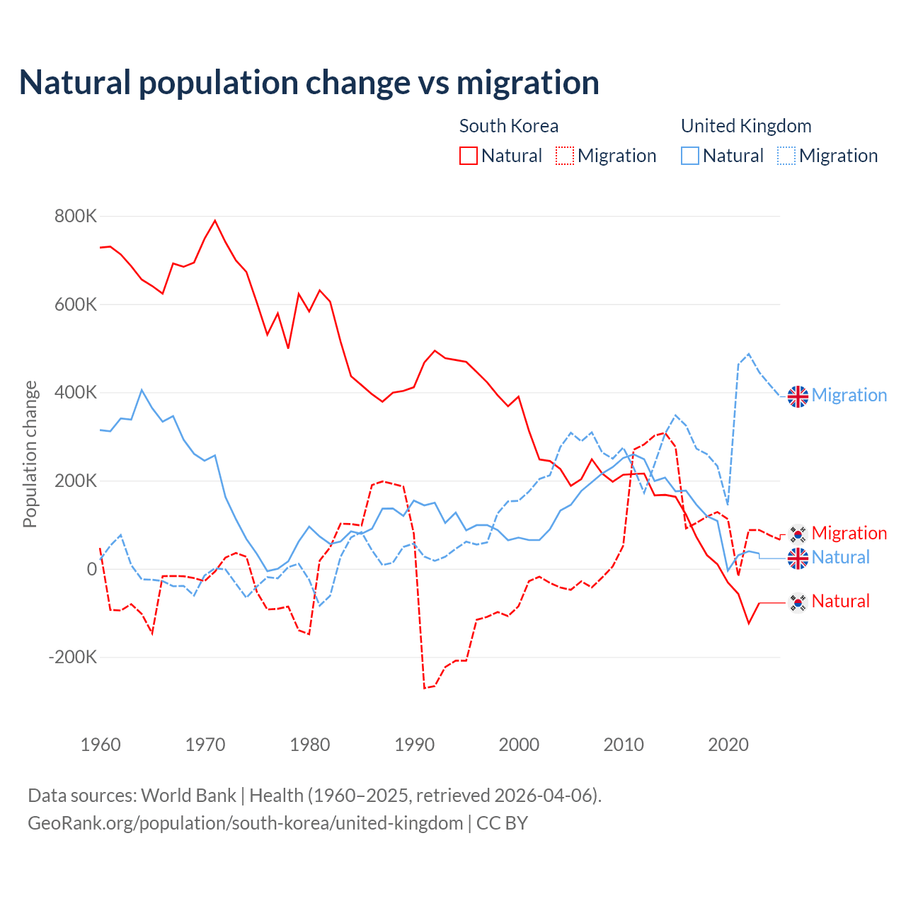 Over the last 10 years, 17.6% of the population change in South Korea is from natural causes (a gain of 277,215 people) and 82.4% is from migration (a gain of 1,298,356 people). In the United Kingdom 23.9% is from natural causes (a gain of 1,033,129 people) and 76.1% is from migration (a gain of 3,283,101 people).