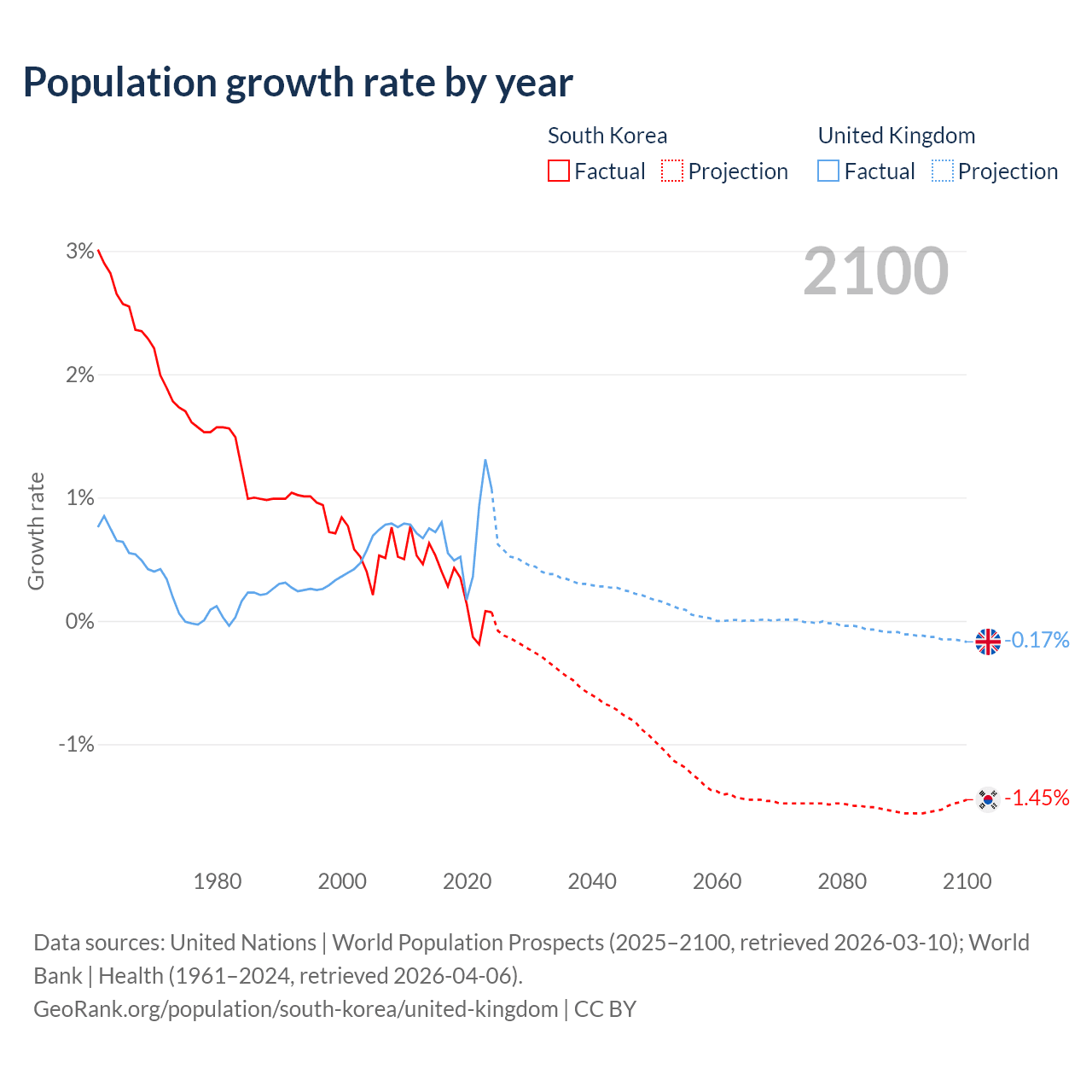 - For the last 10 years, South Korea has had an average growth rate of +0.24% per year vs +0.7% in the United Kingdom.