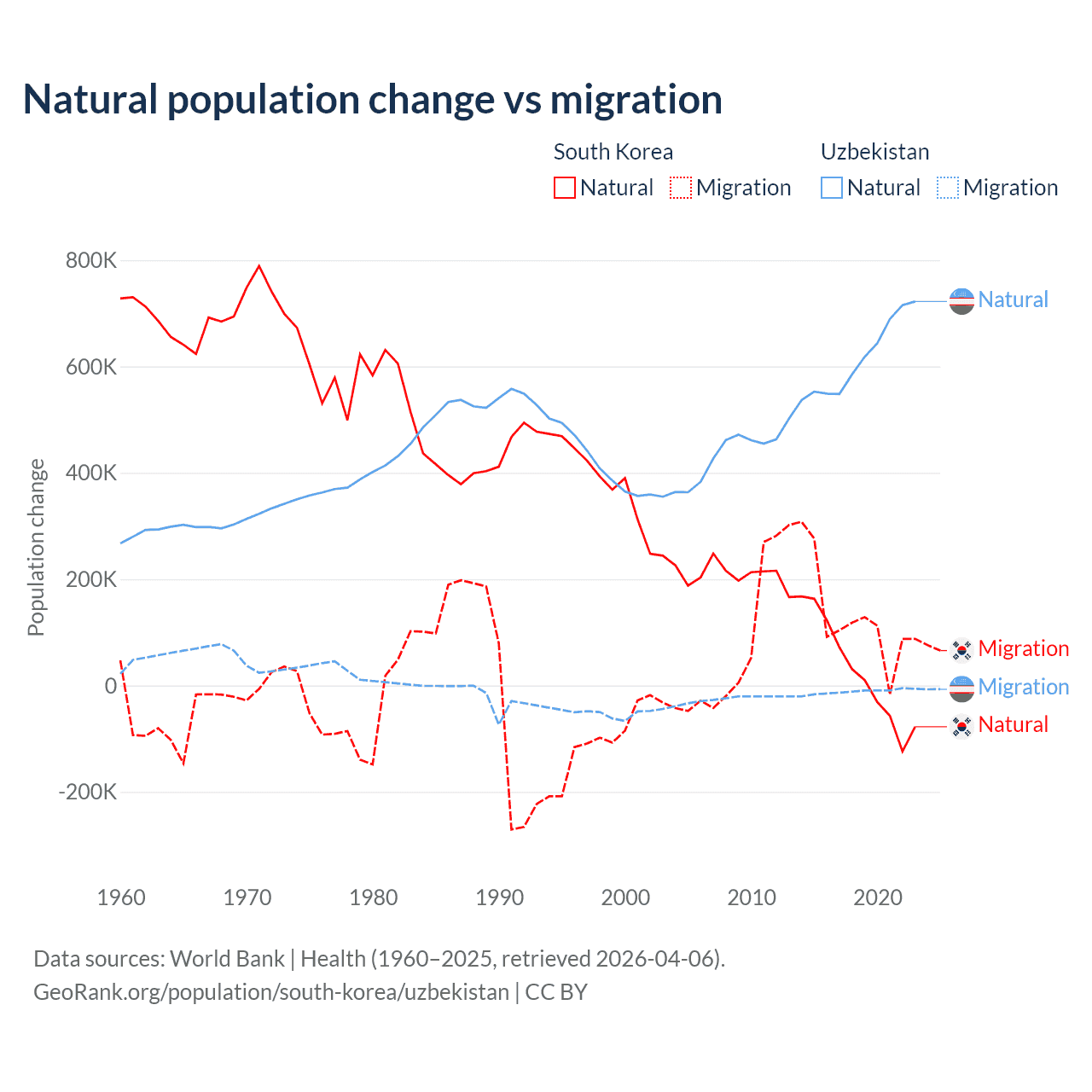 Over the last 10 years, 17.6% of the population change in South Korea is from natural causes (a gain of 277,215 people) and 82.4% is from migration (a gain of 1,298,356 people). In Uzbekistan 98.2% is from natural causes (a gain of 6,161,117 people) and 1.84% is from migration (a loss of 115,398 people).