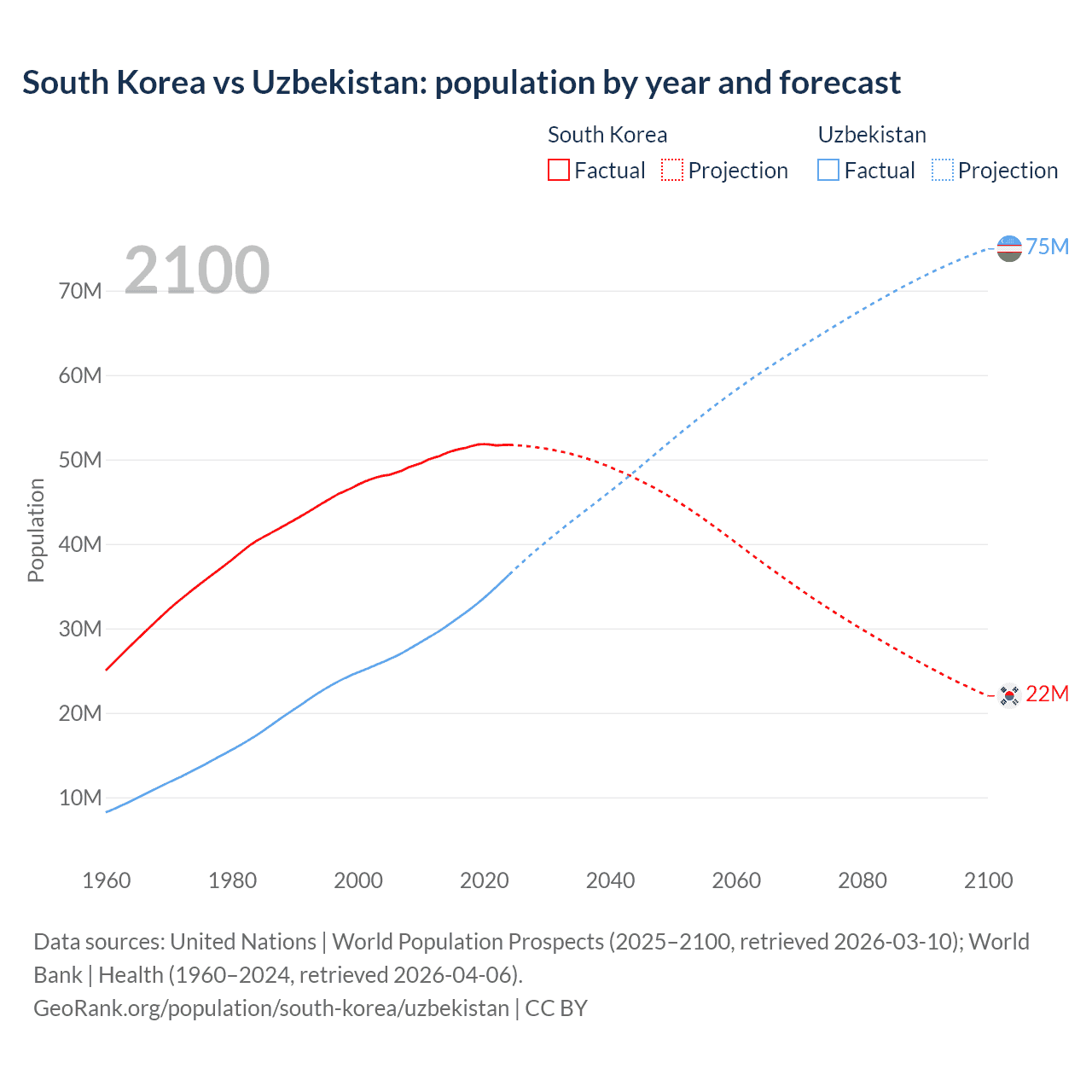 The latest officially reported population of South Korea was 51,751,065 in 2024 vs 36,361,859 people in Uzbekistan in 2024. In 2026, based on the adjusted UN estimation, the current South Korea's population is 51,649,918 people compared to 37,939,105 in Uzbekistan.