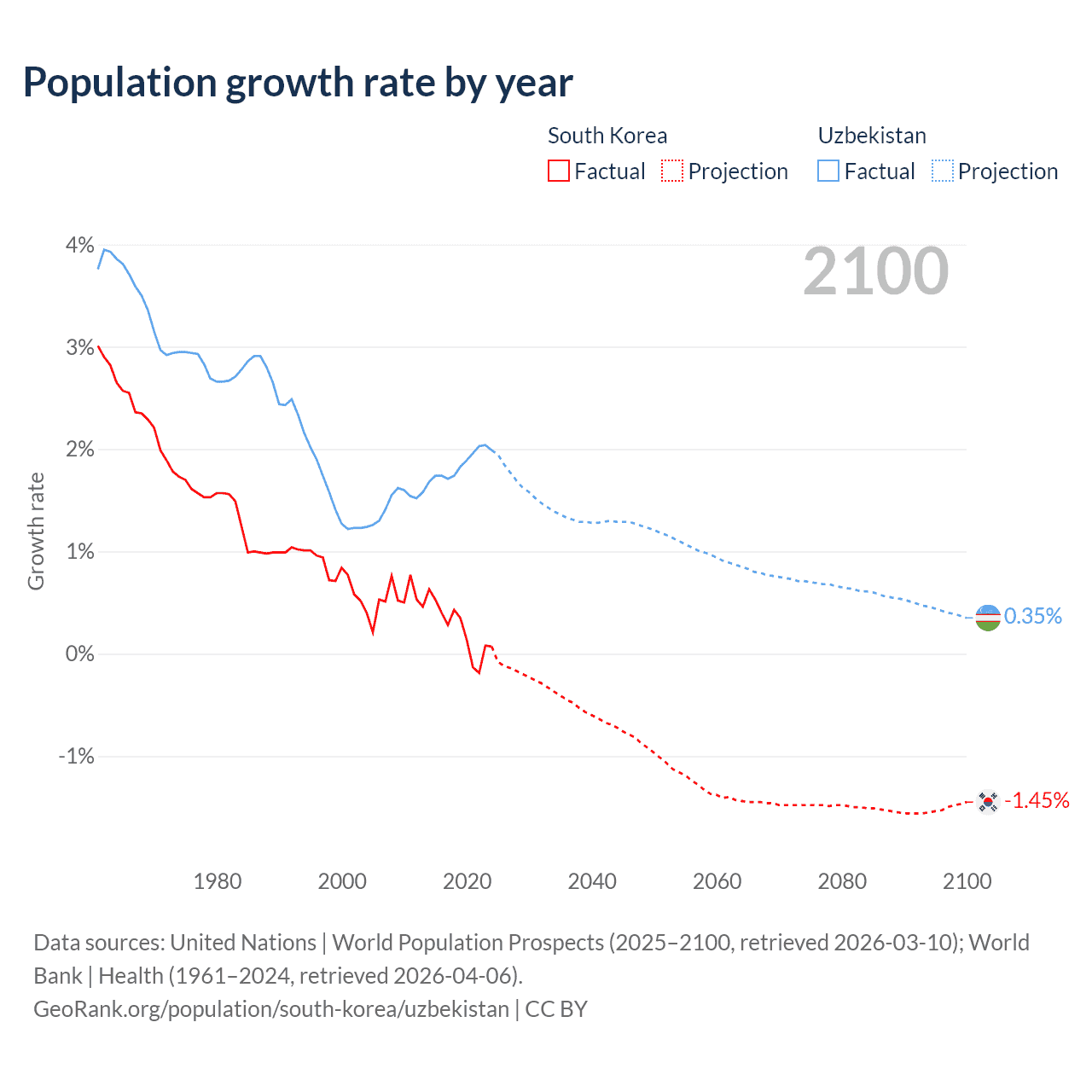 - For the last 10 years, South Korea has had an average growth rate of +0.24% per year vs +1.85% in Uzbekistan.