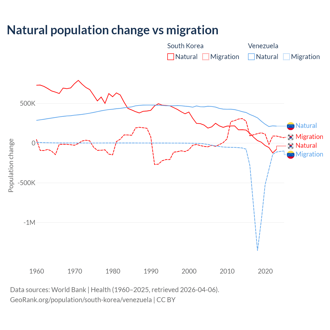 Over the last 10 years, 17.6% of the population change in South Korea is from natural causes (a gain of 277,215 people) and 82.4% is from migration (a gain of 1,298,356 people). In Venezuela 38.6% is from natural causes (a gain of 2,946,257 people) and 61.4% is from migration (a loss of 4,683,227 people).