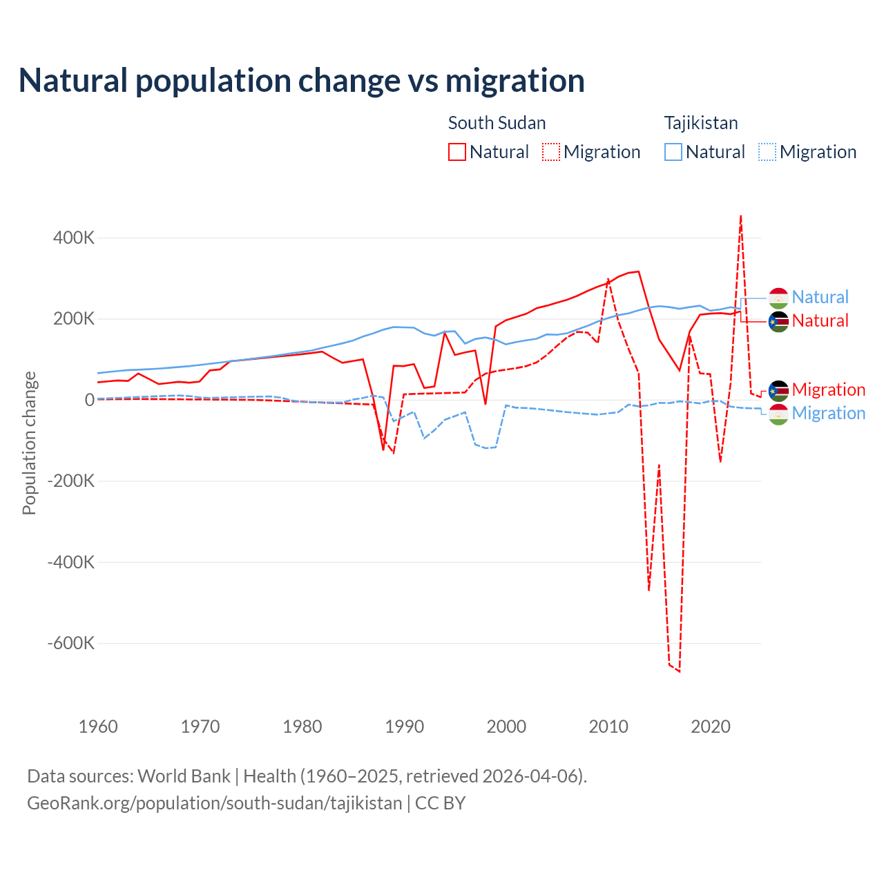 Over the last 10 years, 57.4% of the population change in South Sudan is from natural causes (a gain of 1,792,135 people) and 42.6% is from migration (a loss of 1,329,606 people). In Tajikistan 96% is from natural causes (a gain of 2,266,045 people) and 3.95% is from migration (a loss of 93,205 people).