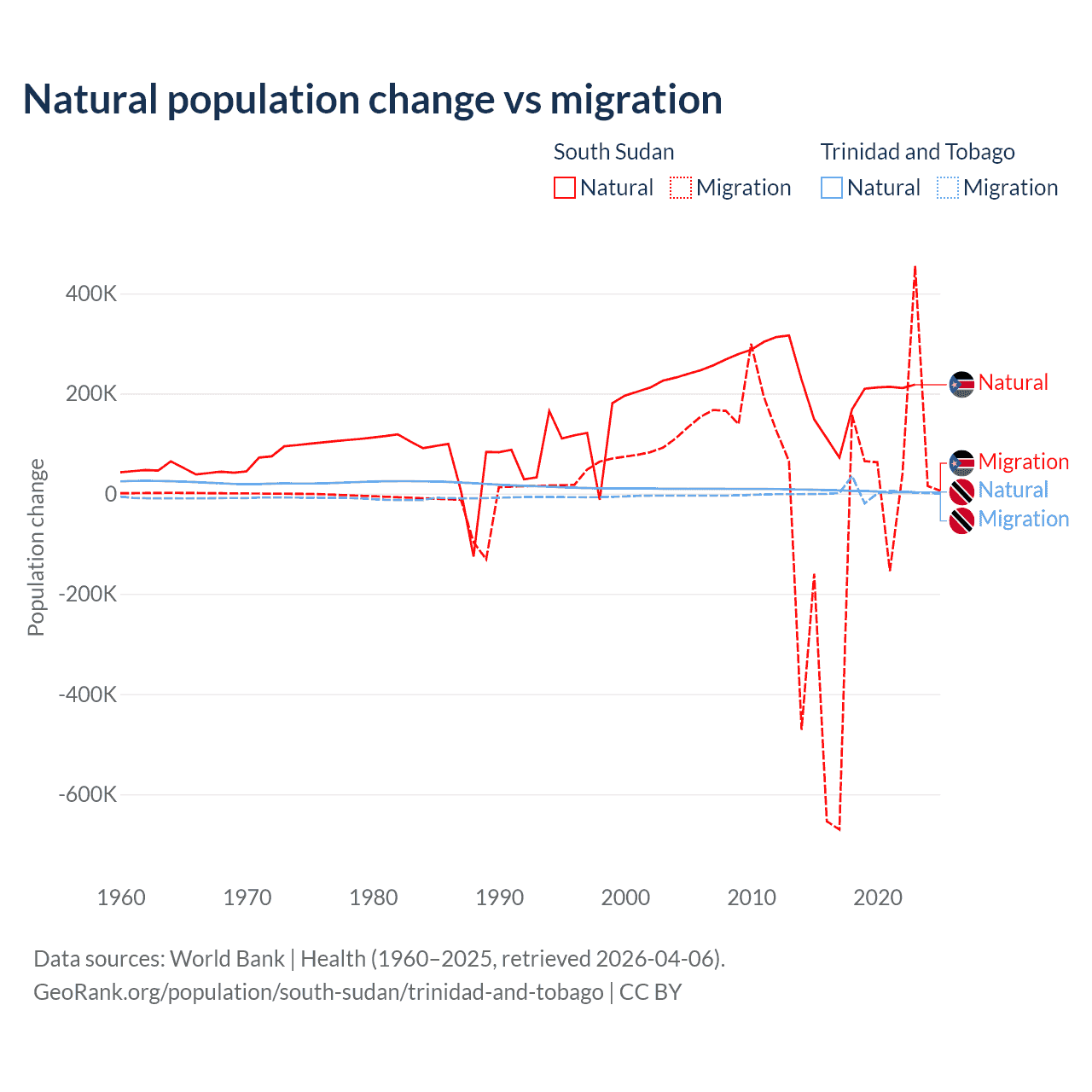 Over the last 10 years, 57.4% of the population change in South Sudan is from natural causes (a gain of 1,792,135 people) and 42.6% is from migration (a loss of 1,329,606 people). In Trinidad and Tobago 66% is from natural causes (a gain of 55,887 people) and 34% is from migration (a gain of 28,785 people).