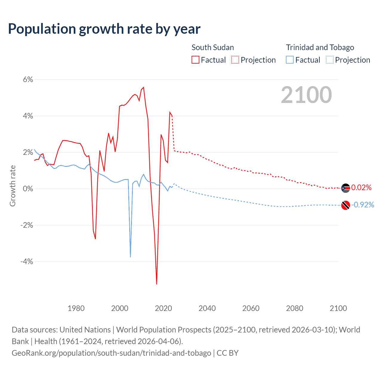 - For the last 10 years, South Sudan has had an average growth rate of +0.65% per year vs +0.19% in Trinidad and Tobago.