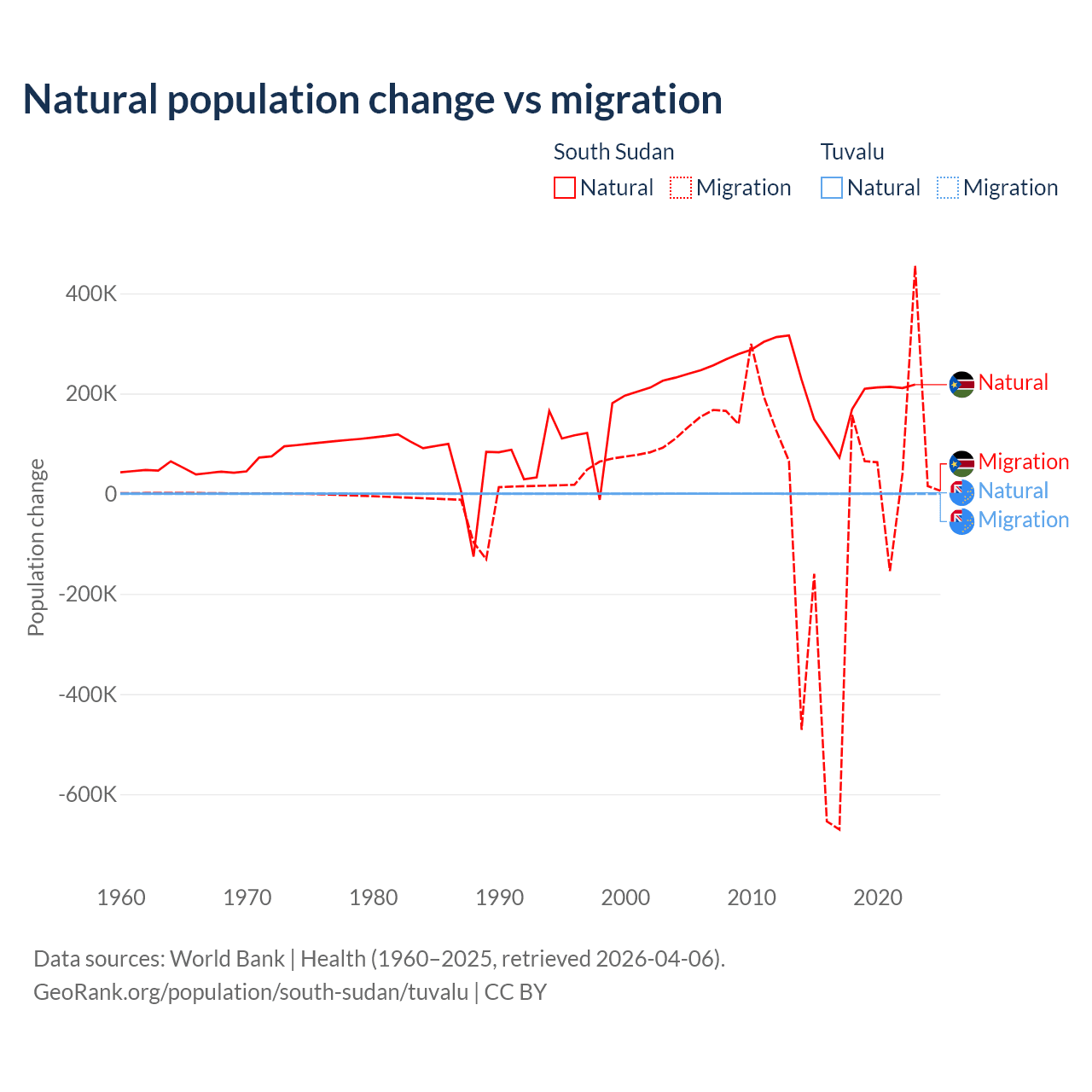 Over the last 10 years, 57.4% of the population change in South Sudan is from natural causes (a gain of 1,792,135 people) and 42.6% is from migration (a loss of 1,329,606 people). In Tuvalu 35.5% is from natural causes (a gain of 1,556 people) and 64.5% is from migration (a loss of 2,827 people).