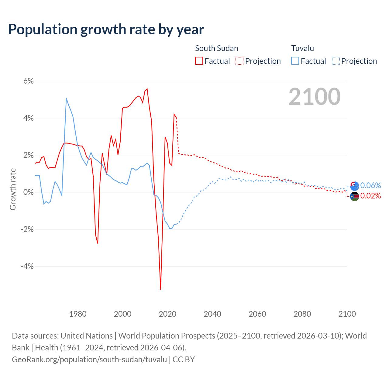- For the last 10 years, South Sudan has had an average growth rate of +0.65% per year vs -1.19% in Tuvalu.