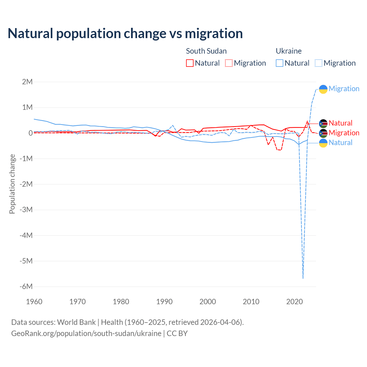 Over the last 10 years, 57.4% of the population change in South Sudan is from natural causes (a gain of 1,792,135 people) and 42.6% is from migration (a loss of 1,329,606 people). In Ukraine 28.2% is from natural causes (a loss of 2,435,153 people) and 71.8% is from migration (a loss of 6,198,995 people).