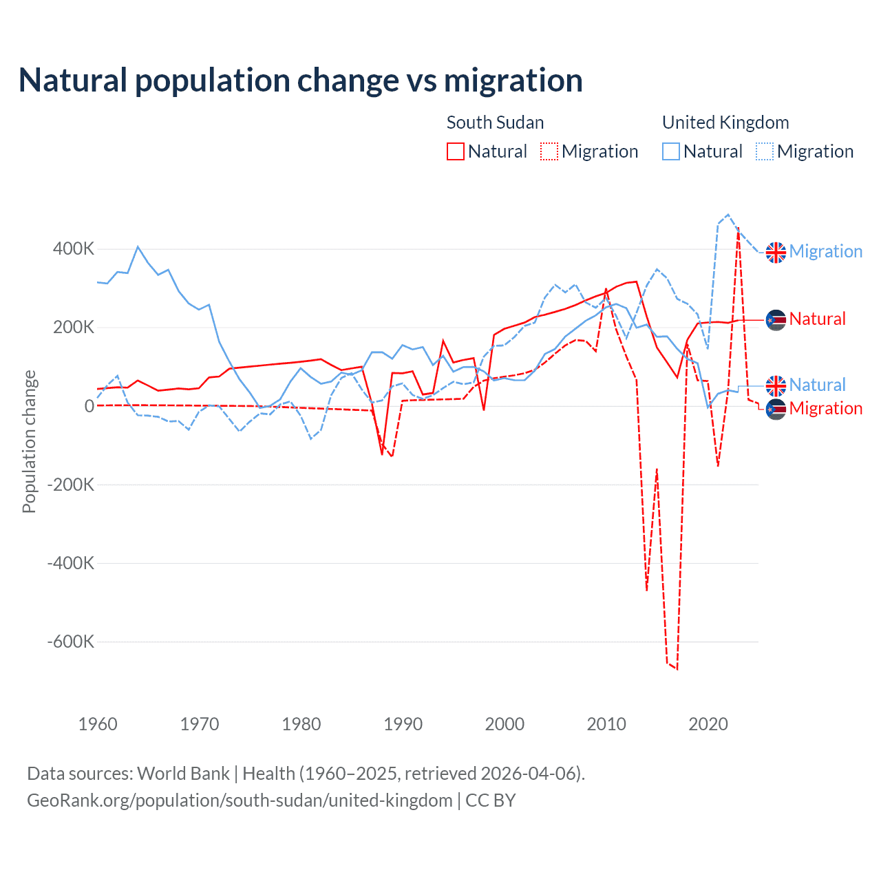 Over the last 10 years, 57.4% of the population change in South Sudan is from natural causes (a gain of 1,792,135 people) and 42.6% is from migration (a loss of 1,329,606 people). In the United Kingdom 23.9% is from natural causes (a gain of 1,033,129 people) and 76.1% is from migration (a gain of 3,283,101 people).