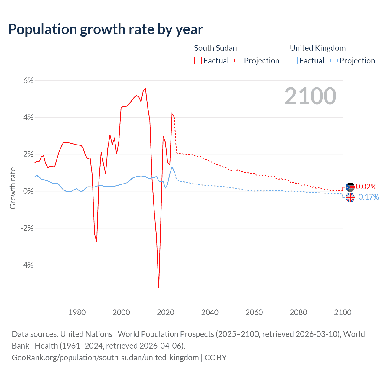 - For the last 10 years, South Sudan has had an average growth rate of +0.65% per year vs +0.7% in the United Kingdom.