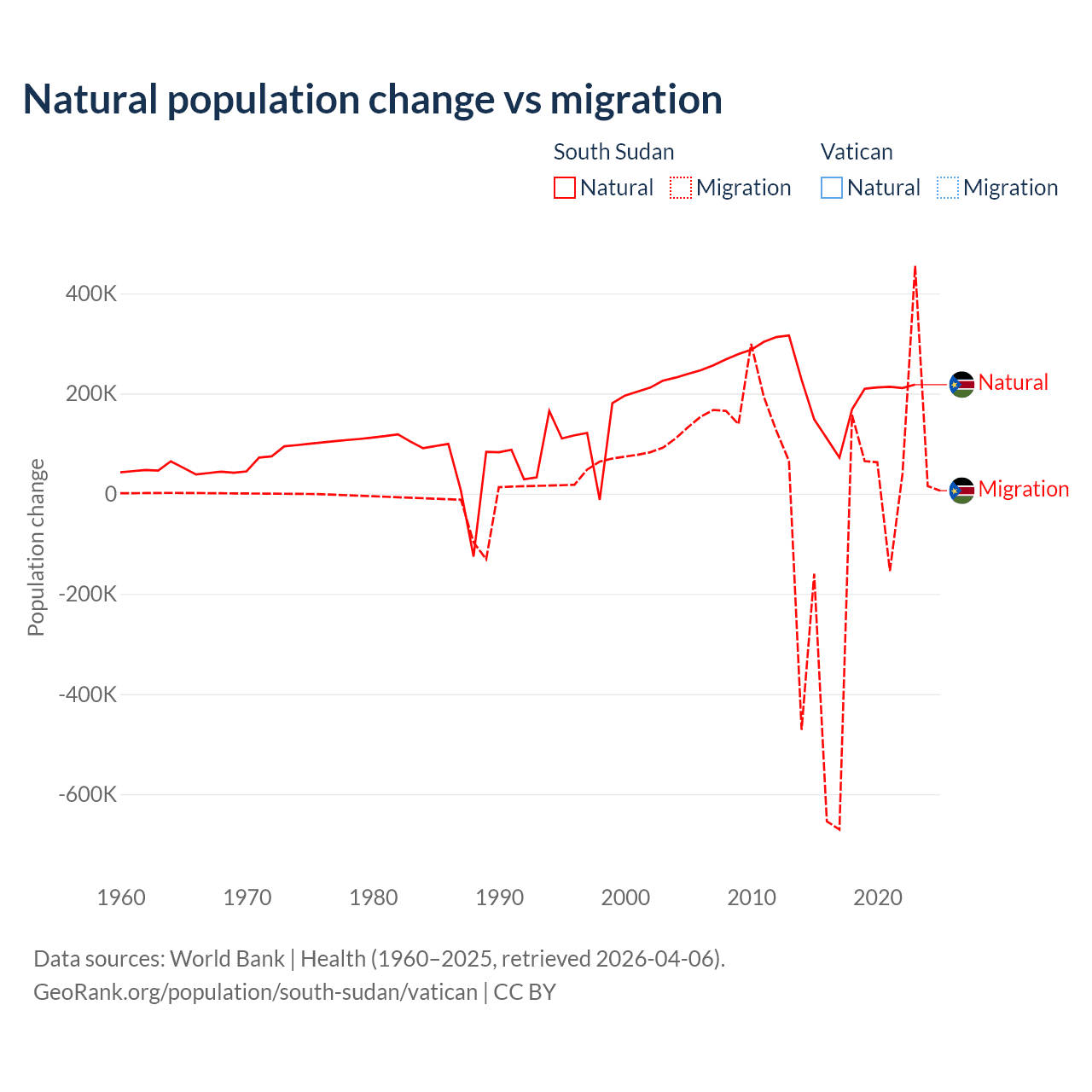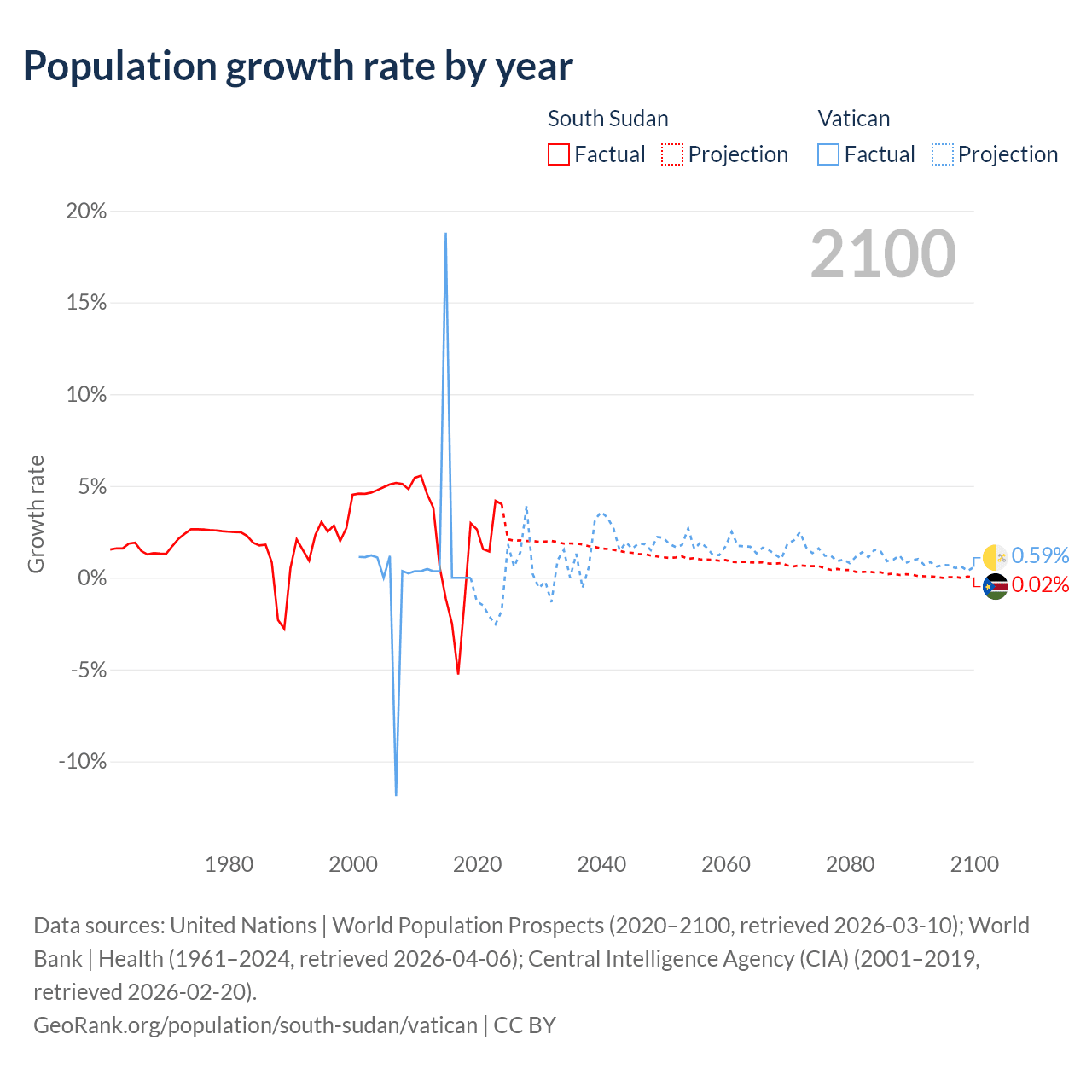 - For the last 10 years, South Sudan has had an average growth rate of +0.65% per year vs +1.9% in the Vatican.
