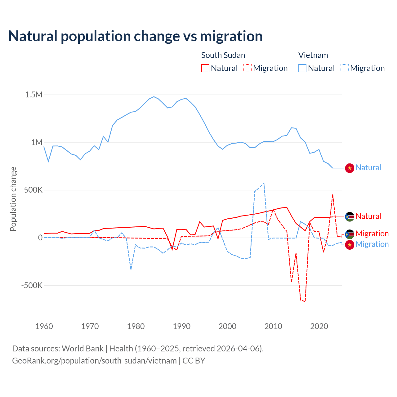 Over the last 10 years, 57.4% of the population change in South Sudan is from natural causes (a gain of 1,792,135 people) and 42.6% is from migration (a loss of 1,329,606 people). In Vietnam 97.7% is from natural causes (a gain of 9,349,756 people) and 2.29% is from migration (a gain of 219,073 people).