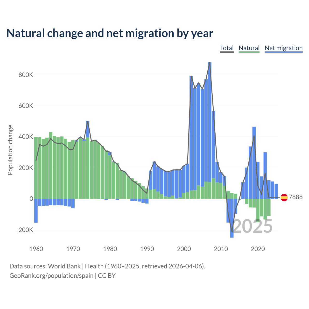 Over the last 10 years, 25.8% of the population change in Spain is from natural causes (a loss of 627,829 people) and 74.2% is from migration (a gain of 1,810,127 people).