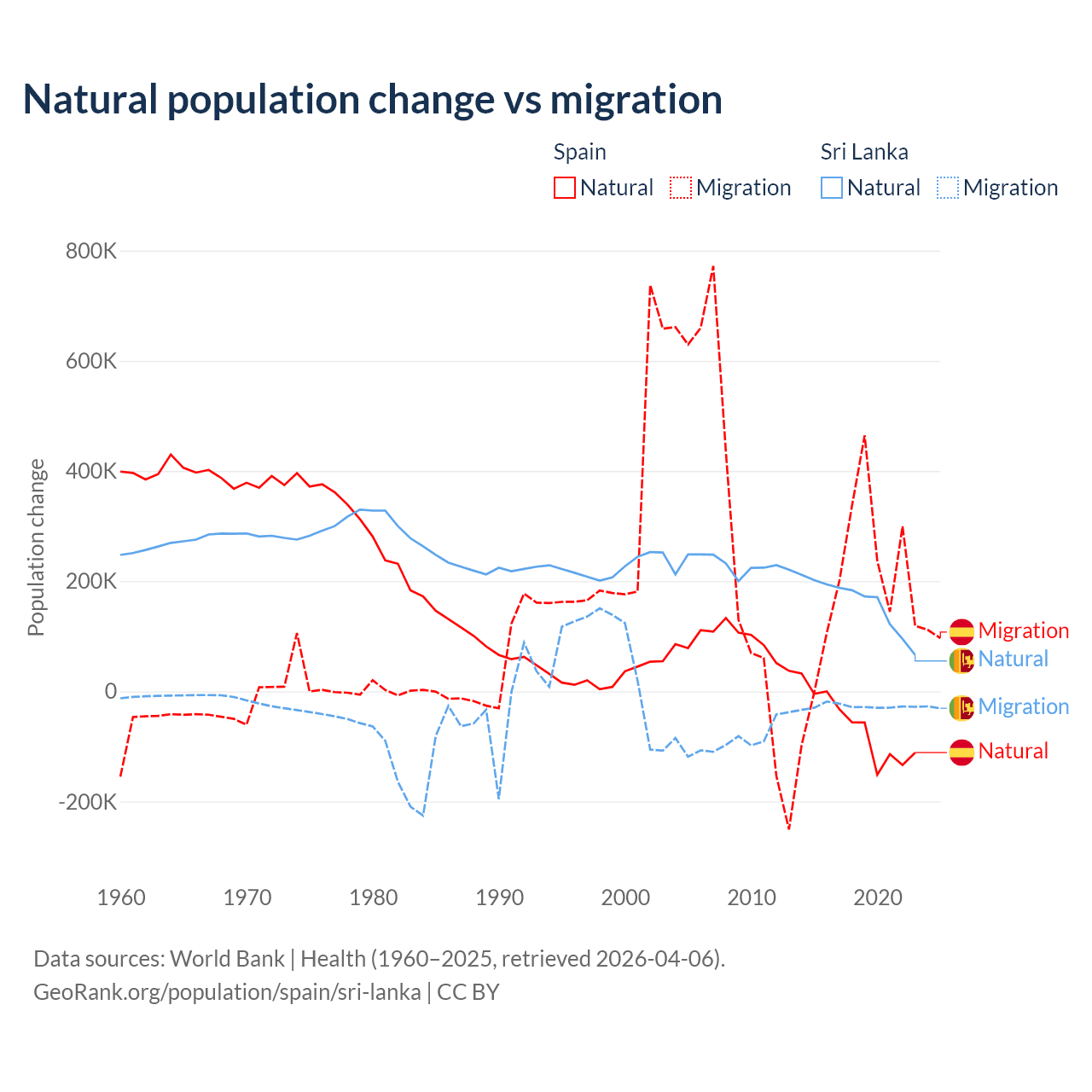 Over the last 10 years, 25.8% of the population change in Spain is from natural causes (a loss of 627,829 people) and 74.2% is from migration (a gain of 1,810,127 people). In Sri Lanka 85.3% is from natural causes (a gain of 1,605,749 people) and 14.7% is from migration (a loss of 276,121 people).