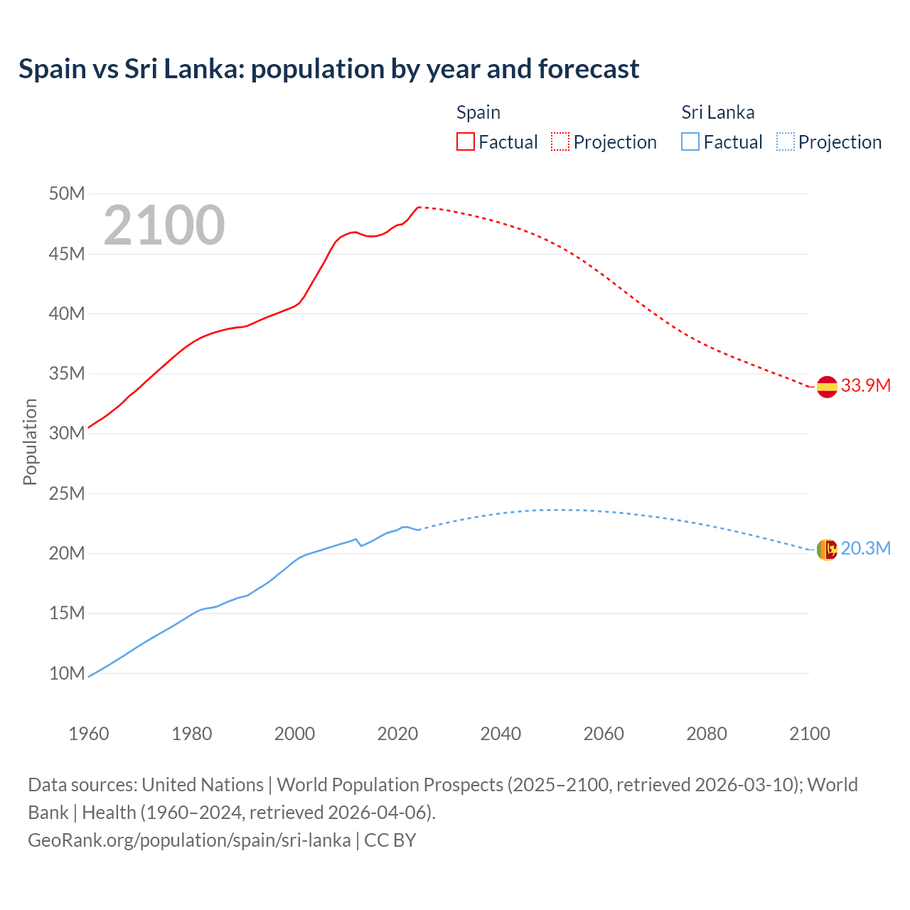 The latest officially reported population of Spain was 48,848,840 in 2024 vs 21,916,000 people in Sri Lanka in 2024. In 2026, based on the adjusted UN estimation, the current Spain's population is 48,806,901 people compared to 22,185,425 in Sri Lanka.