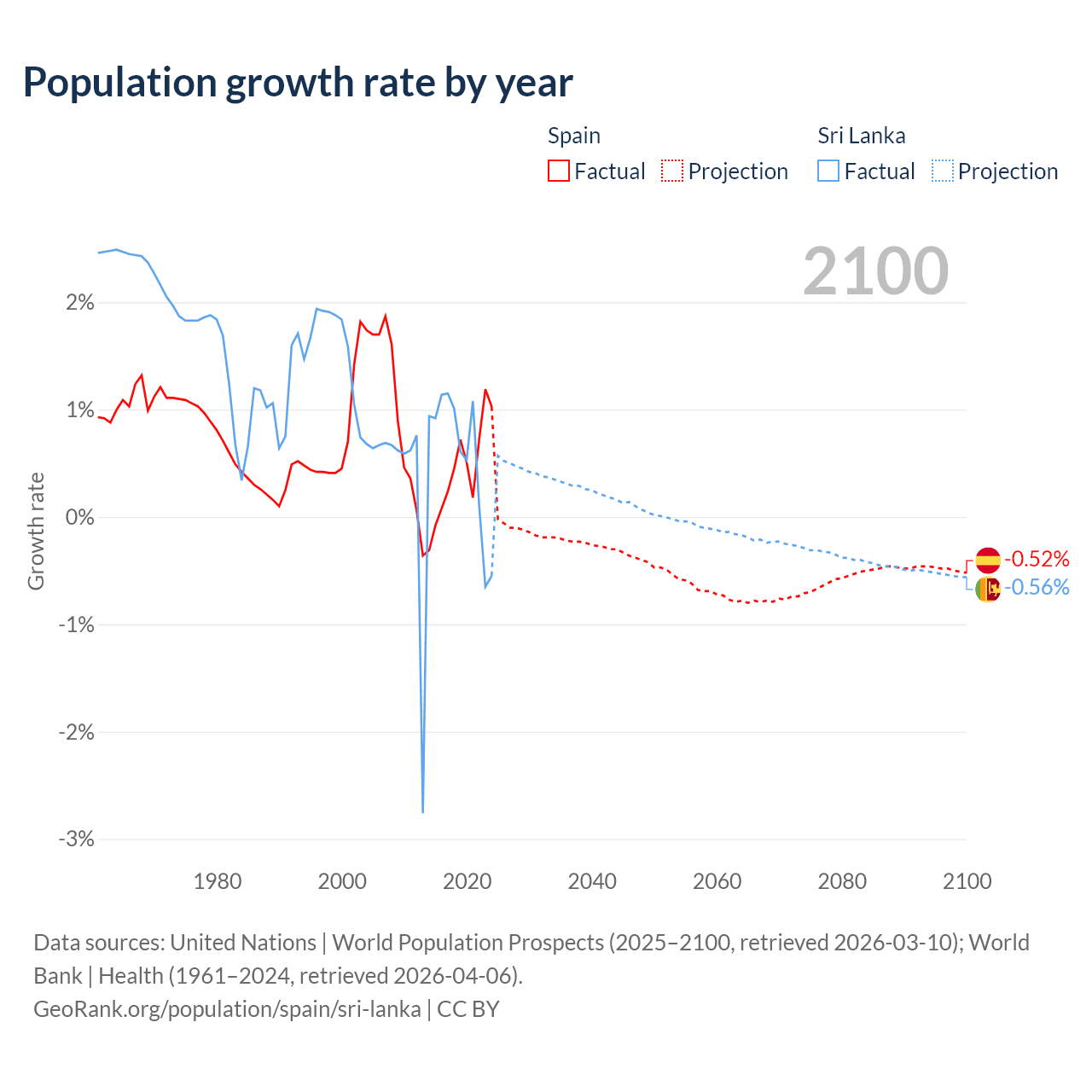 - For the last 10 years, Spain has had an average growth rate of +0.43% per year vs +0.57% in Sri Lanka.